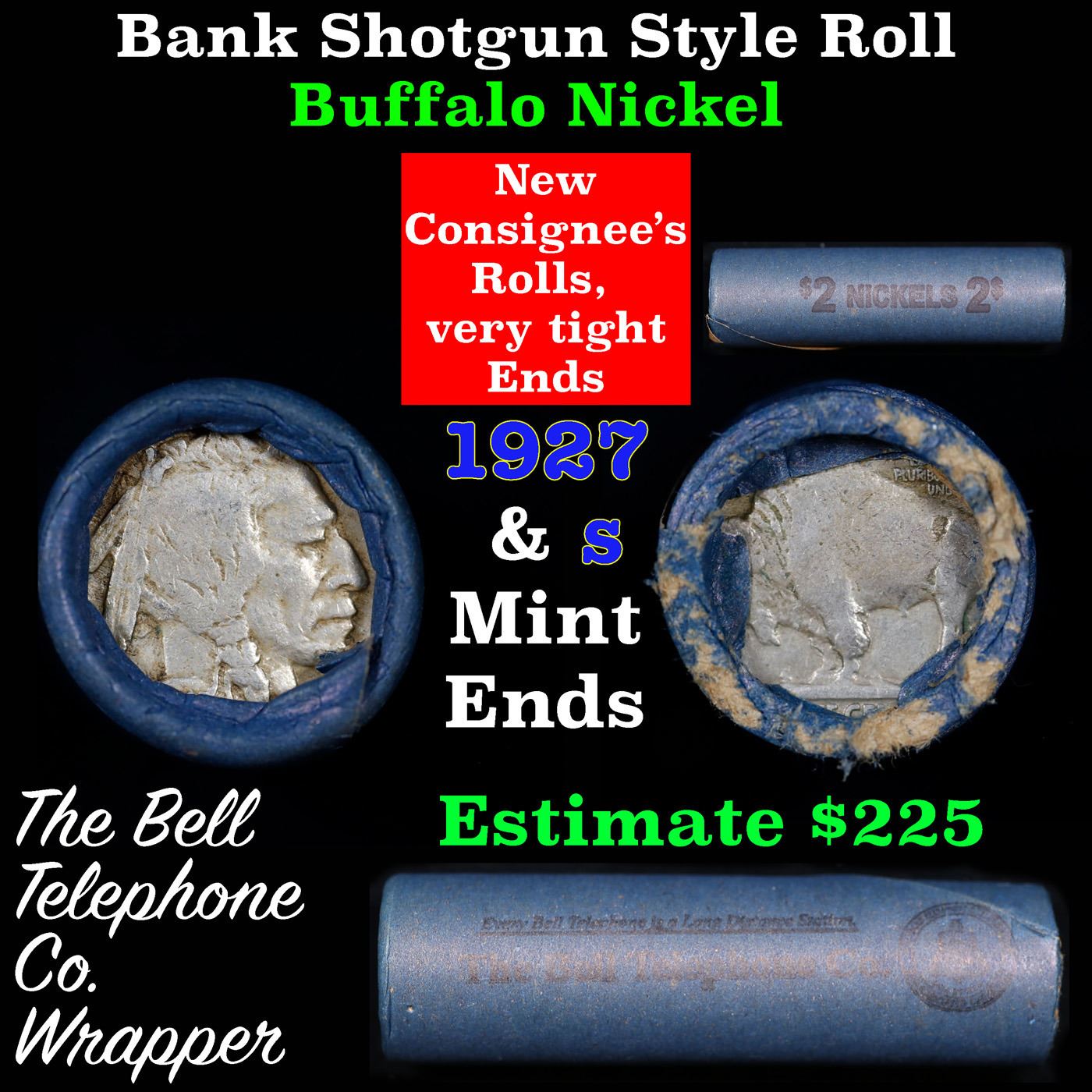 Buffalo Nickel Shotgun Roll in Old Bank Style 'Bell Telephone' Wrapper 1927 & s Mint Ends. The roll is held in an old, rare "Bell Telephone Co." Bank style wrapper. This is the Bell Telephone logo from the 1960's. They are all frrom one Estate. The ends on these rolls are very tight. We will guarantee they are all full dates.