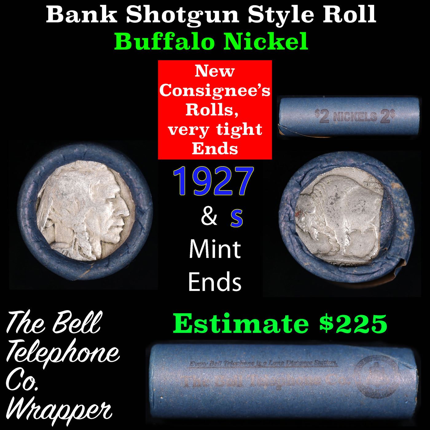 Buffalo Nickel Shotgun Roll in Old Bank Style 'Bell Telephone' Wrapper 1927 & s Mint Ends. The roll is held in an old, rare "Bell Telephone Co." Bank style wrapper. This is the Bell Telephone logo from the 1960's. They are all frrom one Estate. The ends on these rolls are very tight. We will guarantee they are all full dates.