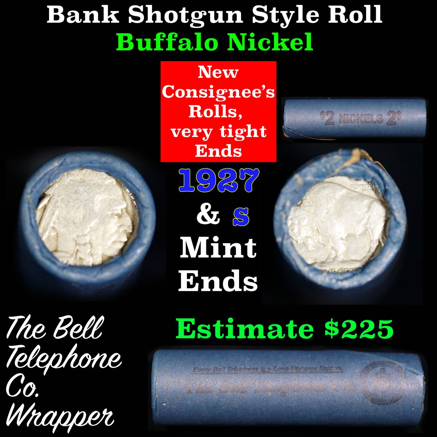 Buffalo Nickel Shotgun Roll in Old Bank Style 'Bell Telephone' Wrapper 1927 & s Mint Ends. The roll is held in an old, rare "Bell Telephone Co." Bank style wrapper. This is the Bell Telephone logo from the 1960's. They are all frrom one Estate. The ends on these rolls are very tight. We will guarantee they are all full dates.