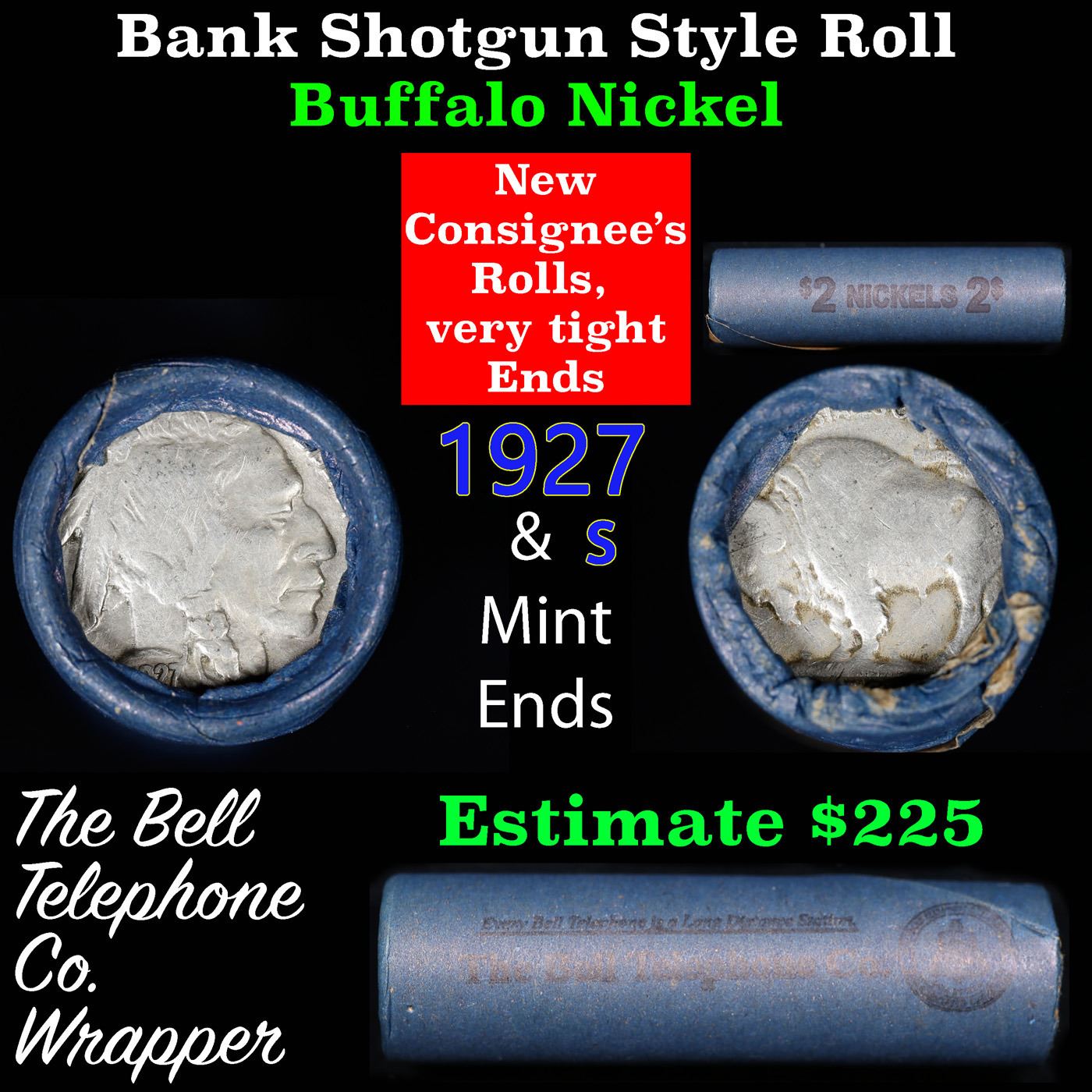 Buffalo Nickel Shotgun Roll in Old Bank Style 'Bell Telephone' Wrapper 1927 &s Mint Ends. The roll is held in an old, rare "Bell Telephone Co." Bank style wrapper. This is the Bell Telephone logo from the 1960's. They are all frrom one Estate. The ends on these rolls are very tight. We will guarantee they are all full dates.