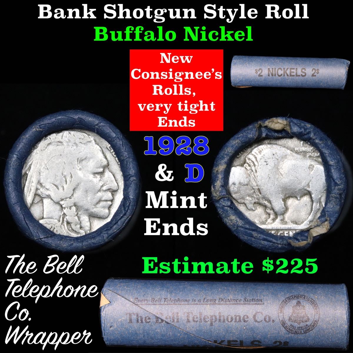 Buffalo Nickel Shotgun Roll in Old Bank Style 'Bell Telephone' Wrapper 1928 & d Mint Ends. The roll is held in an old, rare "Bell Telephone Co." Bank style wrapper. This is the Bell Telephone logo from the 1960's. They are all frrom one Estate. The ends on these rolls are very tight. We will guarantee they are all full dates.