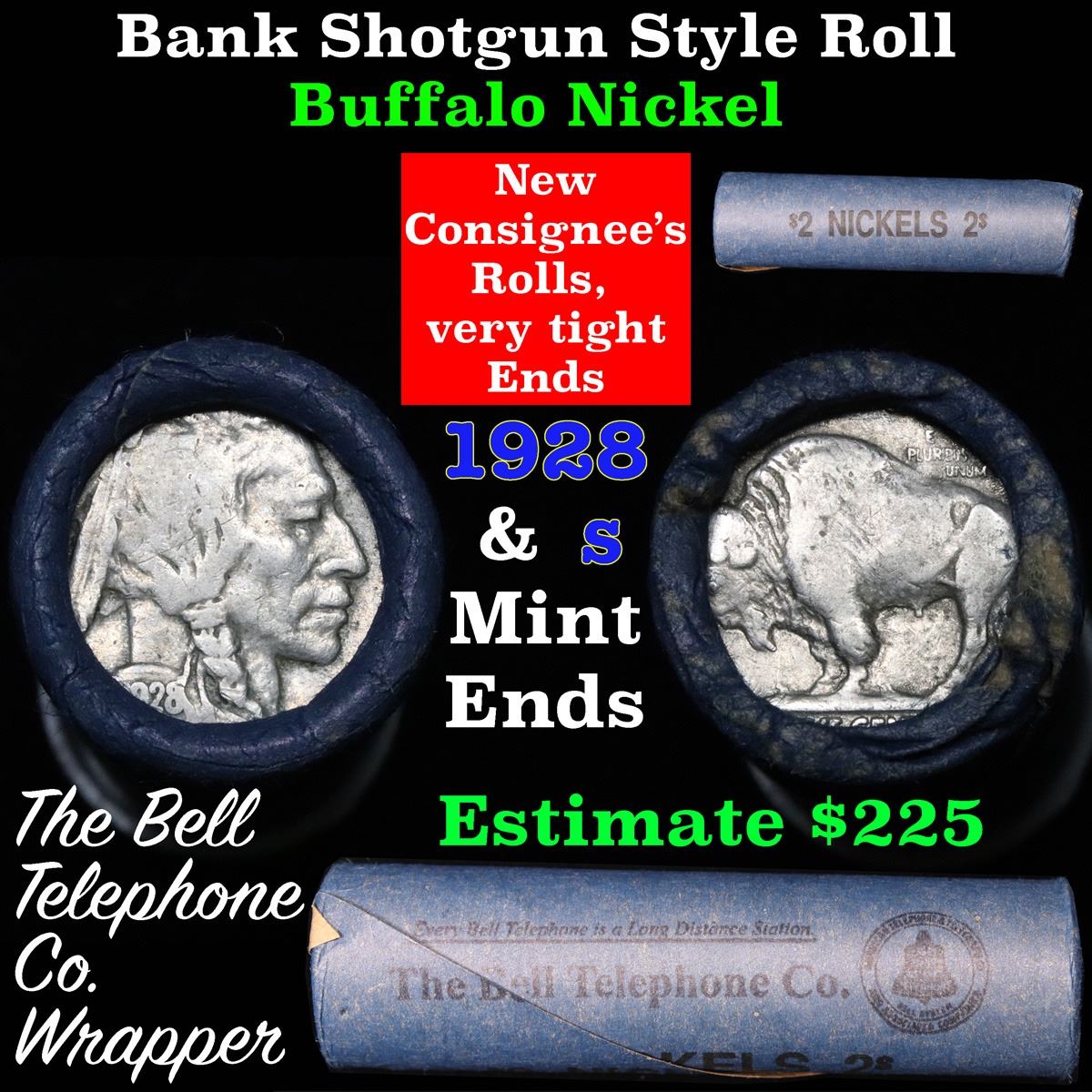 Buffalo Nickel Shotgun Roll in Old Bank Style 'Bell Telephone' Wrapper 1928 & s Mint Ends. The roll is held in an old, rare "Bell Telephone Co." Bank style wrapper. This is the Bell Telephone logo from the 1960's. They are all frrom one Estate. The ends on these rolls are very tight. We will guarantee they are all full dates.