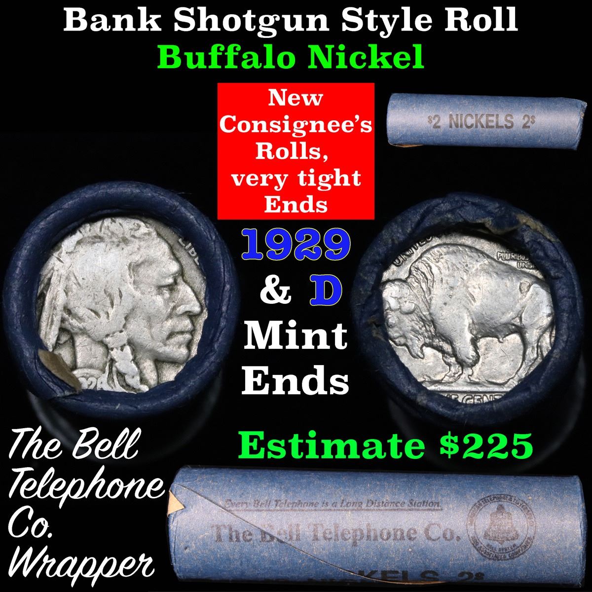 Buffalo Nickel Shotgun Roll in Old Bank Style 'Bell Telephone' Wrapper 1929& d Mint Ends. The roll is held in an old, rare "Bell Telephone Co." Bank style wrapper. This is the Bell Telephone logo from the 1960's. They are all frrom one Estate. The ends on these rolls are very tight. We will guarantee they are all full dates.