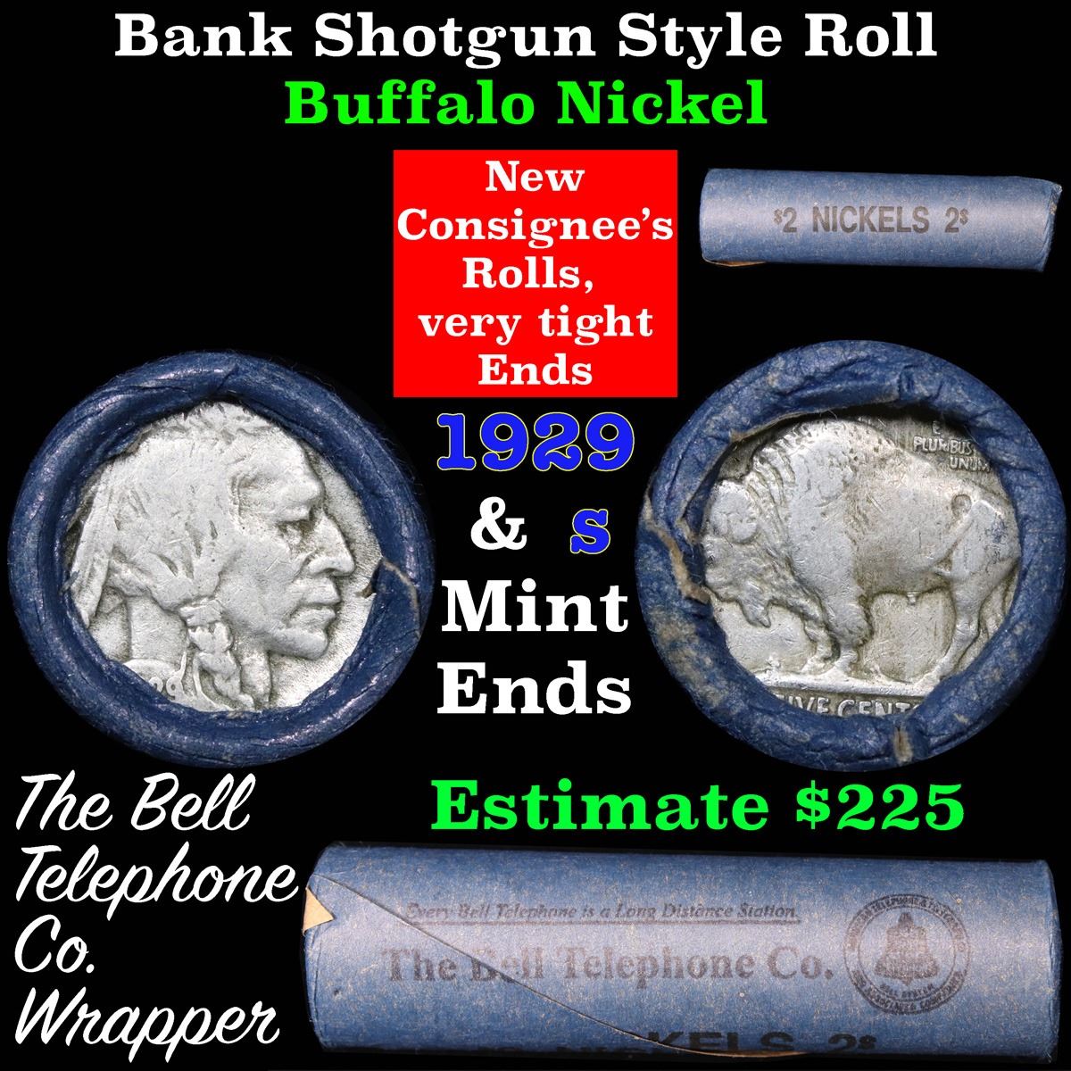 Buffalo Nickel Shotgun Roll in Old Bank Style 'Bell Telephone' Wrapper 1929 & s Mint Ends . .. The roll is held in an old, rare "Bell Telephone Co." Bank style wrapper. This is the Bell Telephone logo from the 1960's. They are all frrom one Estate. The ends on these rolls are very tight. We will guarantee they are all full dates.