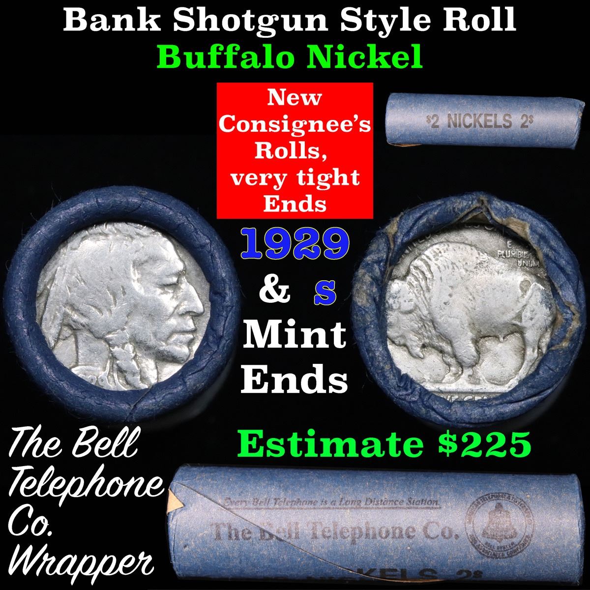 Buffalo Nickel Shotgun Roll in Old Bank Style 'Bell Telephone' Wrapper 1929 & s Mint Ends . .. The roll is held in an old, rare "Bell Telephone Co." Bank style wrapper. This is the Bell Telephone logo from the 1960's. They are all frrom one Estate. The ends on these rolls are very tight. We will guarantee they are all full dates.