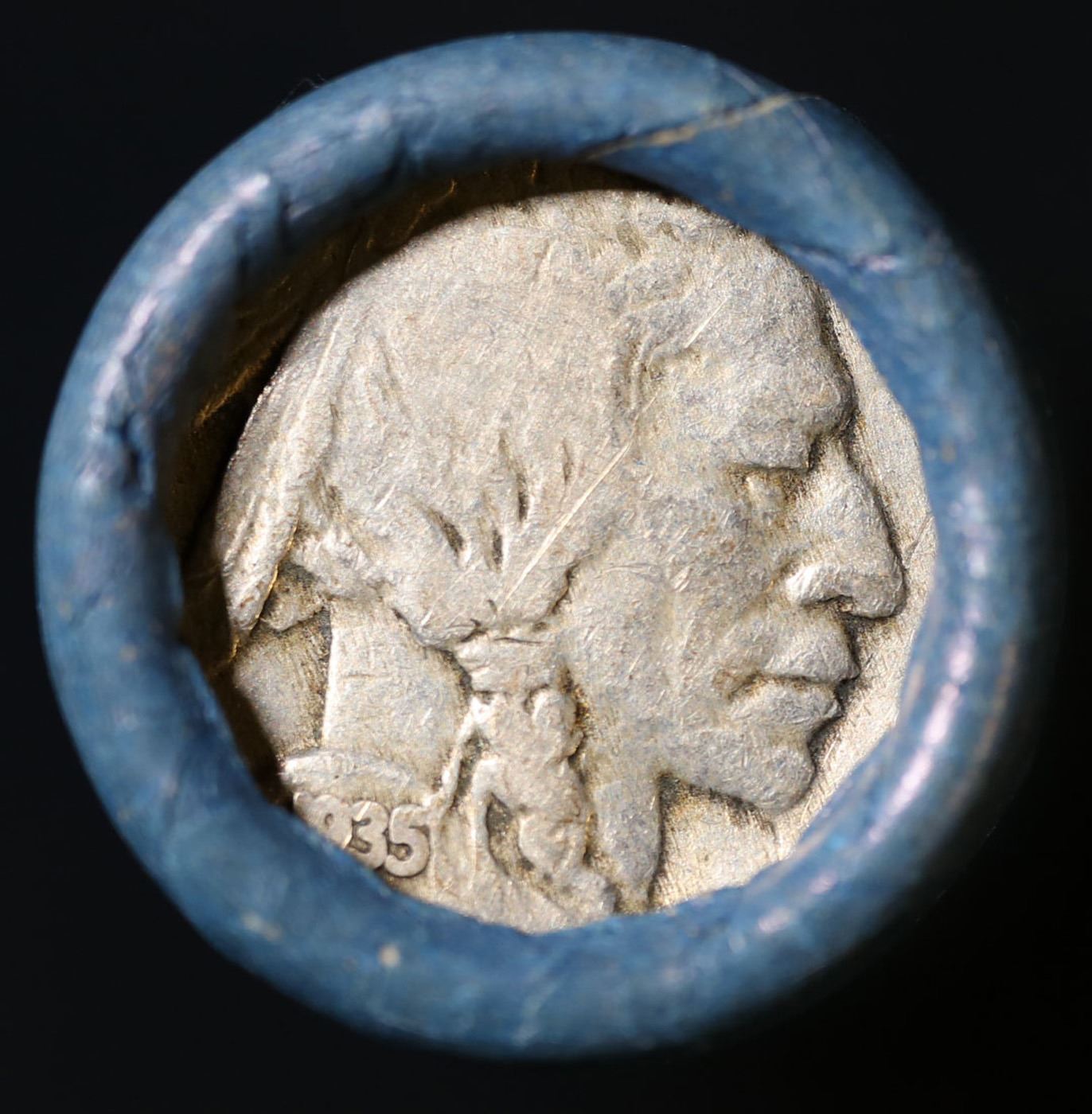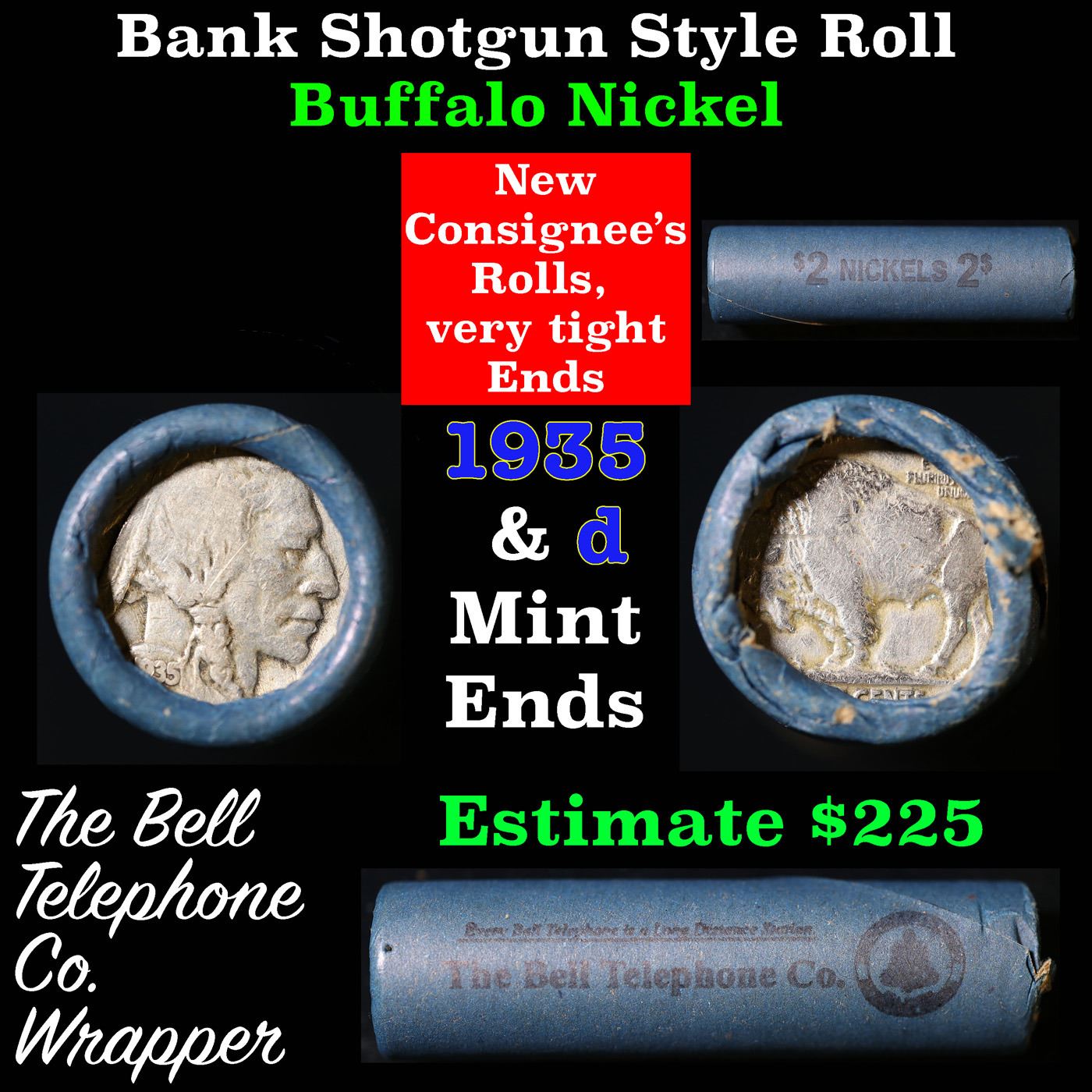 Buffalo Nickel Shotgun Roll in Old Bank Style 'Bell Telephone' Wrapper 1935 & D Mint Ends.. The roll is held in an old, rare "Bell Telephone Co." Bank style wrapper. This is the Bell Telephone logo from the 1960's. They are all frrom one Estate. The ends on these rolls are very tight. We will guarantee they are all full dates.
