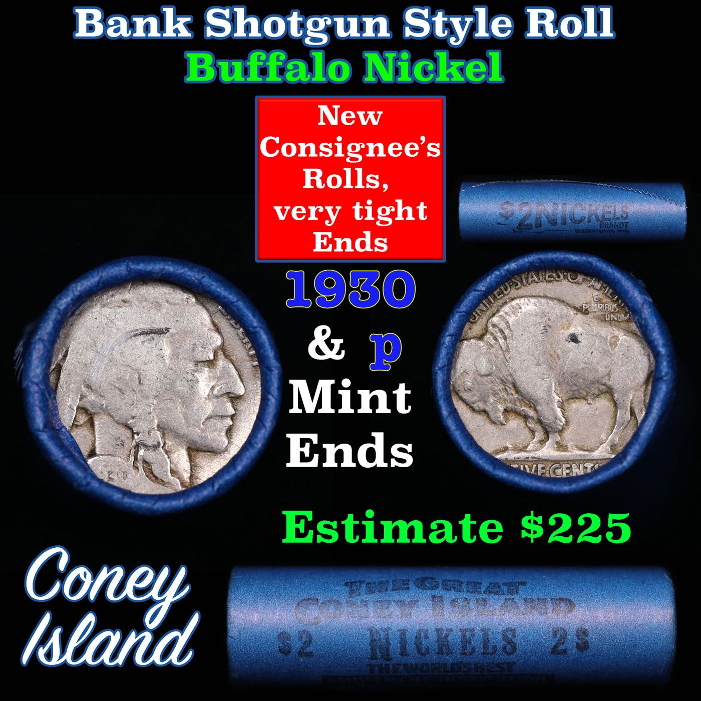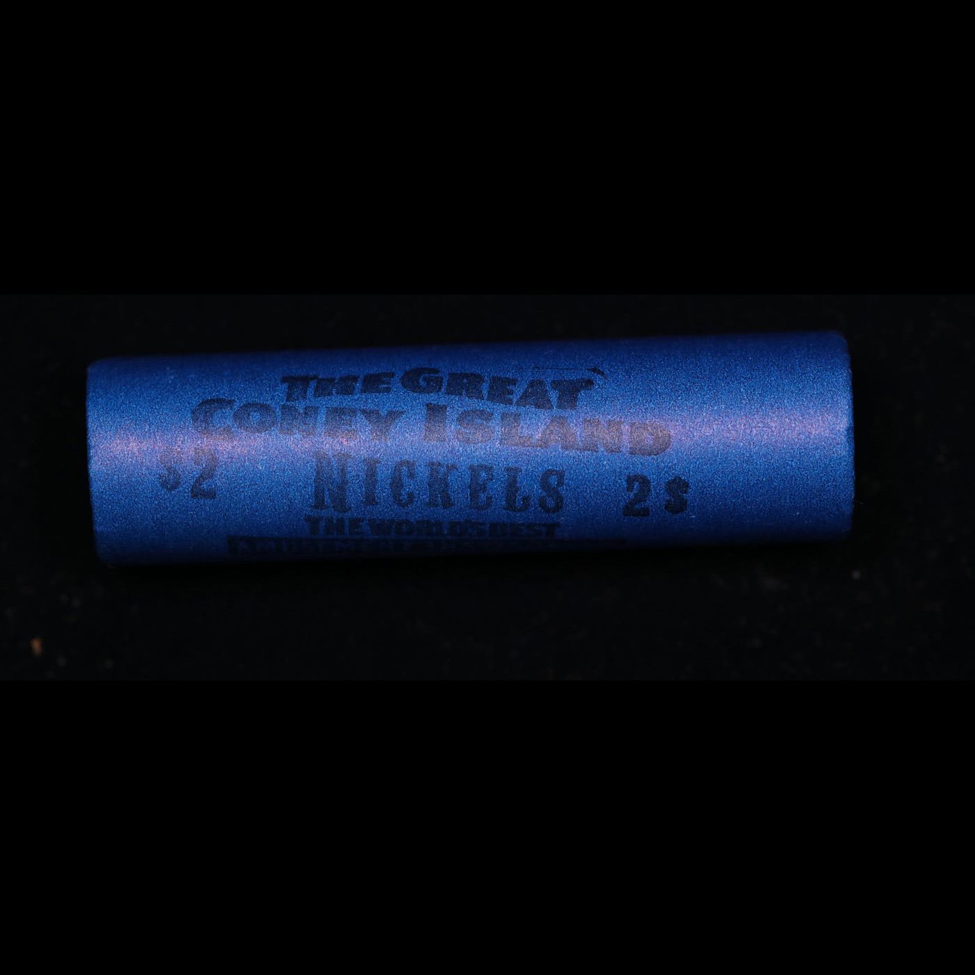 Buffalo Nickel Shotgun Roll in Old Bank Style 'Coney Island' Wrapper 1930 &p Mint Ends. The roll is held in an old, rare "Brandt Coney Island." Bank style wrapper. The Roll is Stampled "The Great Coney Island The Worlds Best Amusement Institution", "Brandt $2 Nickels". They are all frrom one Estate. The ends on these rolls are very tight. We will guarantee they are all full dates.