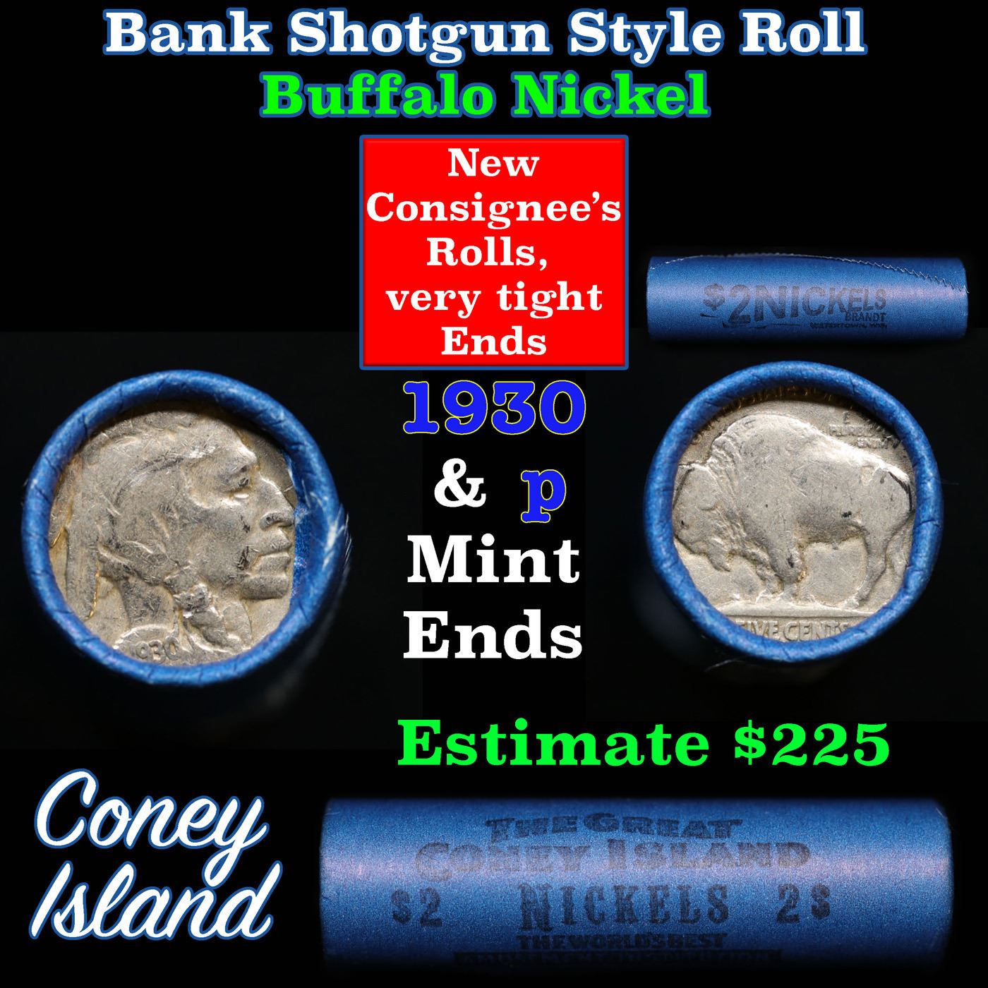 Buffalo Nickel Shotgun Roll in Old Bank Style 'Coney Island' Wrapper 1930 &p Mint Ends. The roll is held in an old, rare "Brandt Coney Island." Bank style wrapper. The Roll is Stampled "The Great Coney Island The Worlds Best Amusement Institution", "Brandt $2 Nickels". They are all frrom one Estate. The ends on these rolls are very tight. We will guarantee they are all full dates.