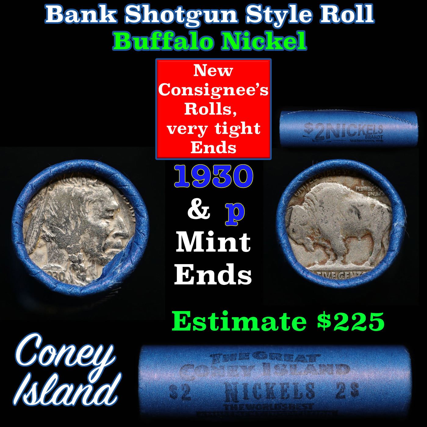 Buffalo Nickel Shotgun Roll in Old Bank Style 'Coney Island' Wrapper 1930 &p Mint Ends. The roll is held in an old, rare "Brandt Coney Island." Bank style wrapper. The Roll is Stampled "The Great Coney Island The Worlds Best Amusement Institution", "Brandt $2 Nickels". They are all frrom one Estate. The ends on these rolls are very tight. We will guarantee they are all full dates.