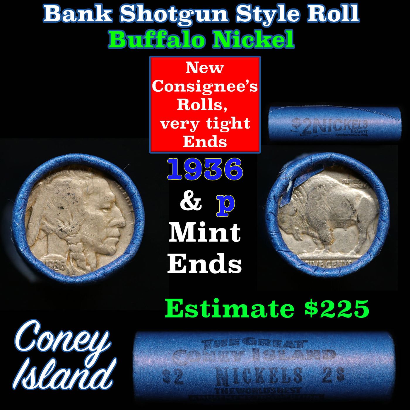 Buffalo Nickel Shotgun Roll in Old Bank Style 'Coney Island' Wrapper 1936 &p Mint Ends. The roll is held in an old, rare "Brandt Coney Island." Bank style wrapper. The Roll is Stampled "The Great Coney Island The Worlds Best Amusement Institution", "Brandt $2 Nickels". They are all frrom one Estate. The ends on these rolls are very tight. We will guarantee they are all full dates.