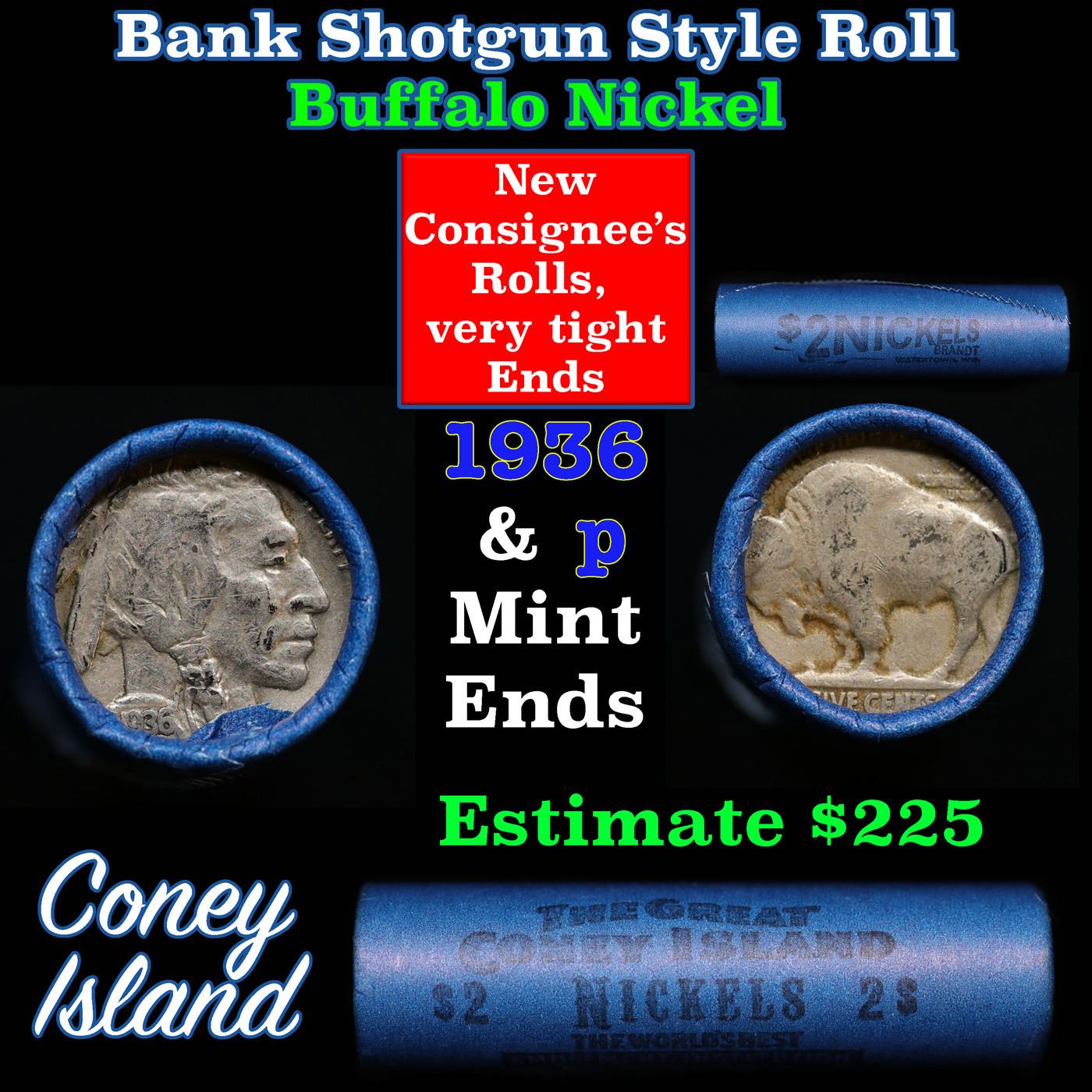 Buffalo Nickel Shotgun Roll in Old Bank Style 'Coney Island' Wrapper 1936 &p Mint Ends. The roll is held in an old, rare "Brandt Coney Island." Bank style wrapper. The Roll is Stampled "The Great Coney Island The Worlds Best Amusement Institution", "Brandt $2 Nickels". They are all frrom one Estate. The ends on these rolls are very tight. We will guarantee they are all full dates.