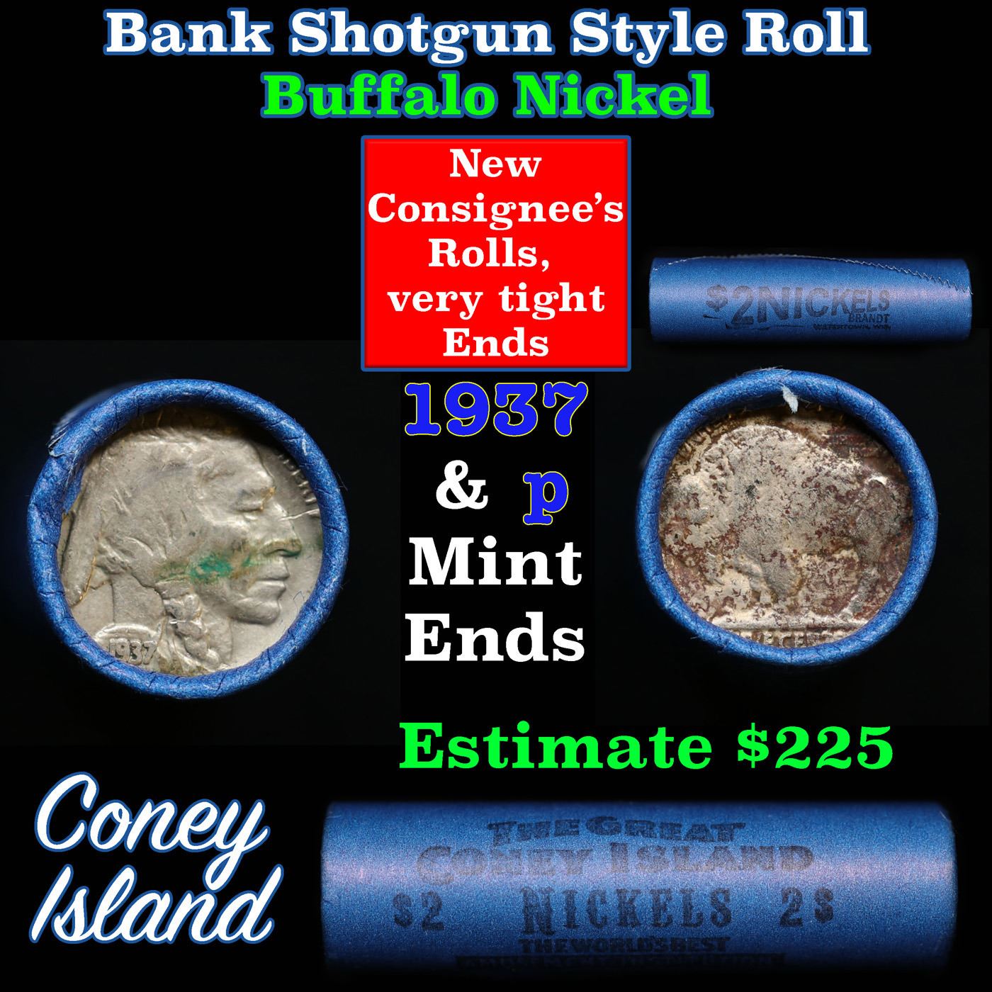 Buffalo Nickel Shotgun Roll in Old Bank Style 'Coney Island' Wrapper 1937 &p Mint Ends. The roll is held in an old, rare "Brandt Coney Island." Bank style wrapper. The Roll is Stampled "The Great Coney Island The Worlds Best Amusement Institution", "Brandt $2 Nickels". They are all frrom one Estate. The ends on these rolls are very tight. We will guarantee they are all full dates.