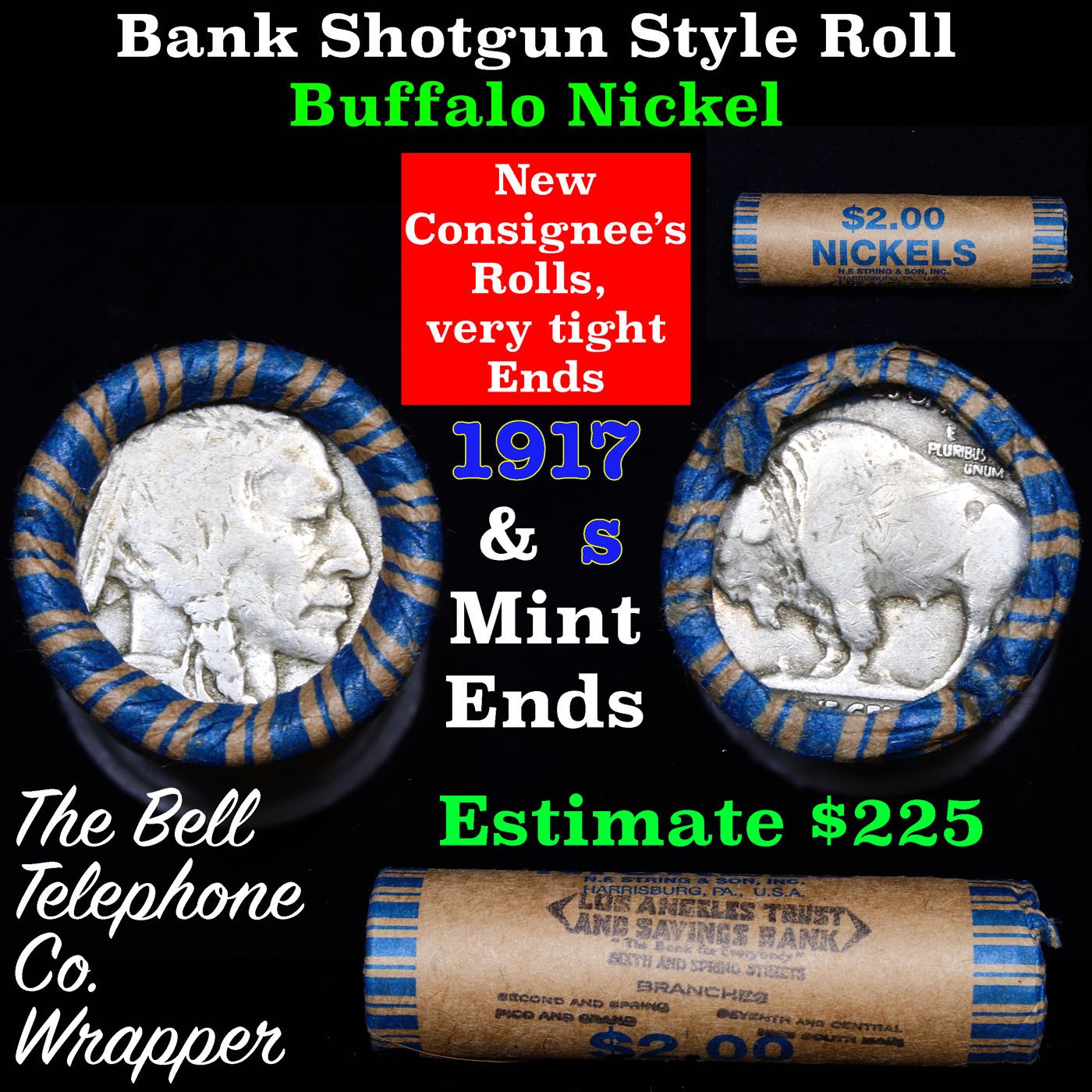 Buffalo Nickel Shotgun Roll in Old Bank Style 'Los Angeles Trust And Savings Bank' Wrapper 1917 & s Mint Ends. The roll is held in an old, rare "Los Angeles Trust And Savings Bank." Bank style wrapper. They are all frrom one Estate. The ends on these rolls are very tight. We will guarantee they are all full dates.