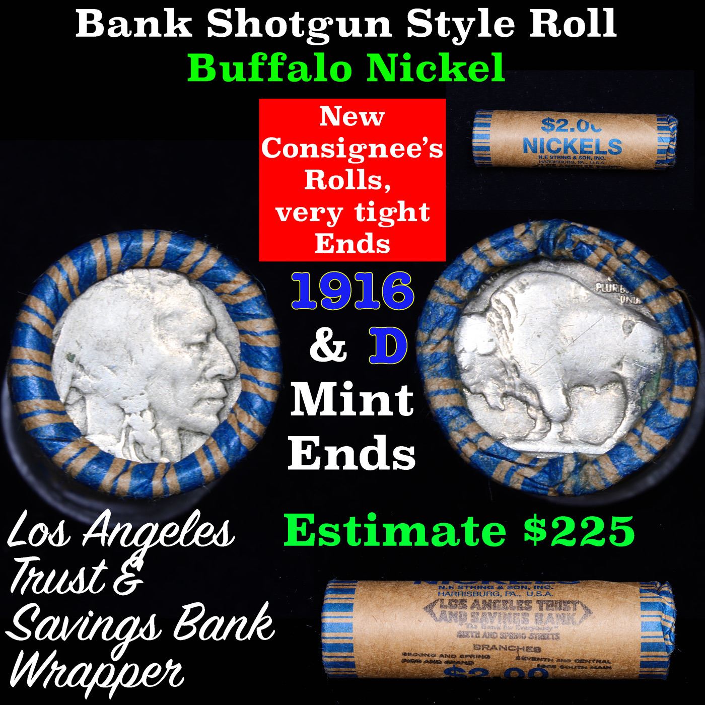 Buffalo Nickel Shotgun Roll in Old Bank Style 'Los Angeles Trust And SavingsBank' Wrapper 1916 & d Mint Ends. The roll is held in an old, rare "Los Angeles Trust And Savings Bank." Bank style wrapper. They are all frrom one Estate. The ends on these rolls are very tight. We will guarantee they are all full dates.