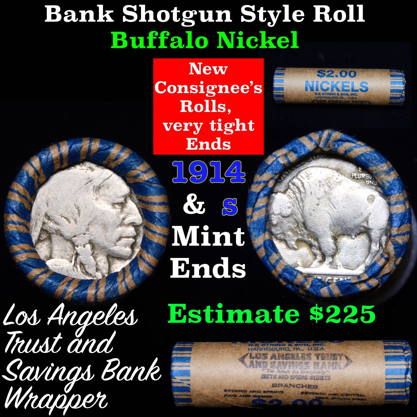 Buffalo Nickel Shotgun Roll in Old Bank Style 'Los Angeles Trust And Savins Bank'  Wrapper 1914 & s Mint Ends.        The roll is held in an old, rare "Los Angeles Trust And Savings Bank." Bank style wrapper.  They are all frrom one Estate. The ends on these rolls are very tight. We will guarantee they are all full dates.