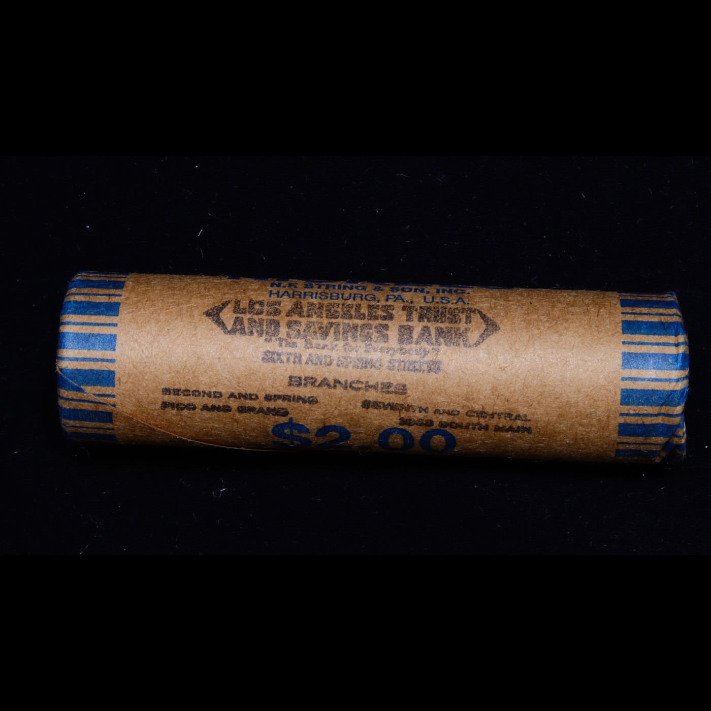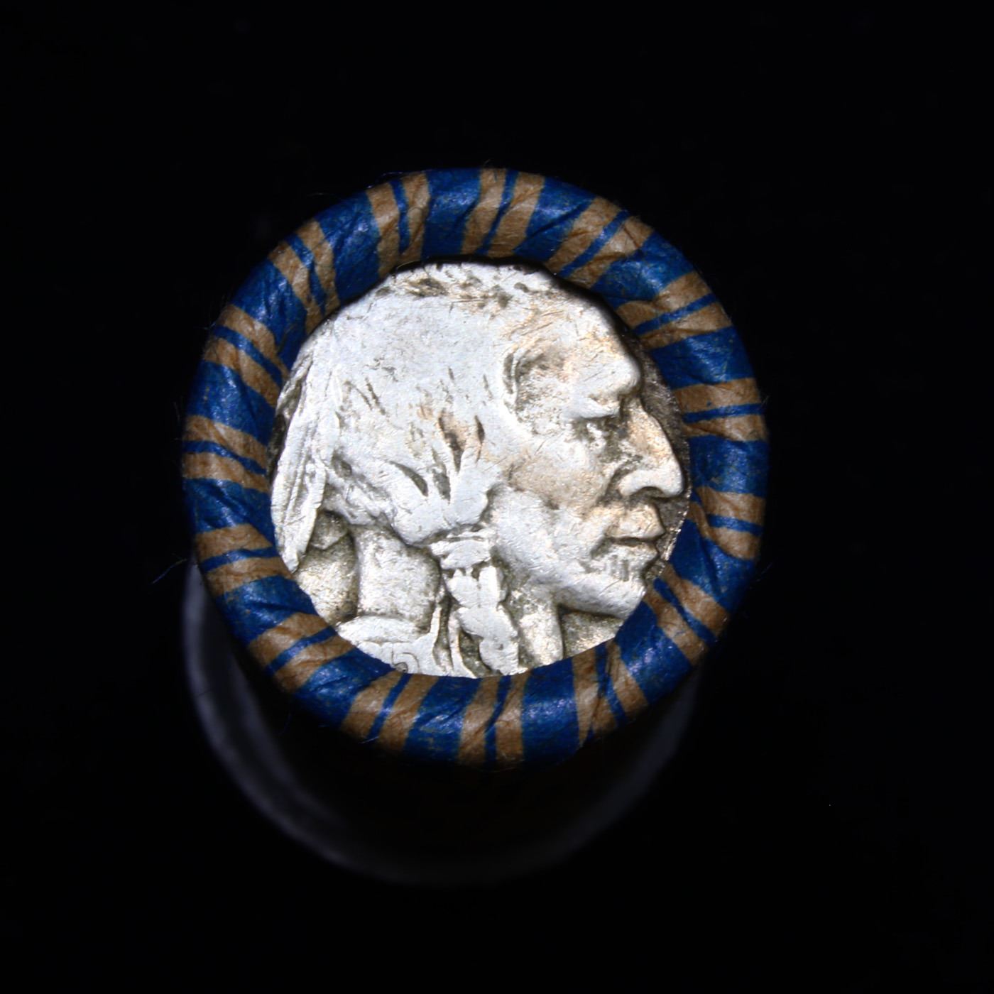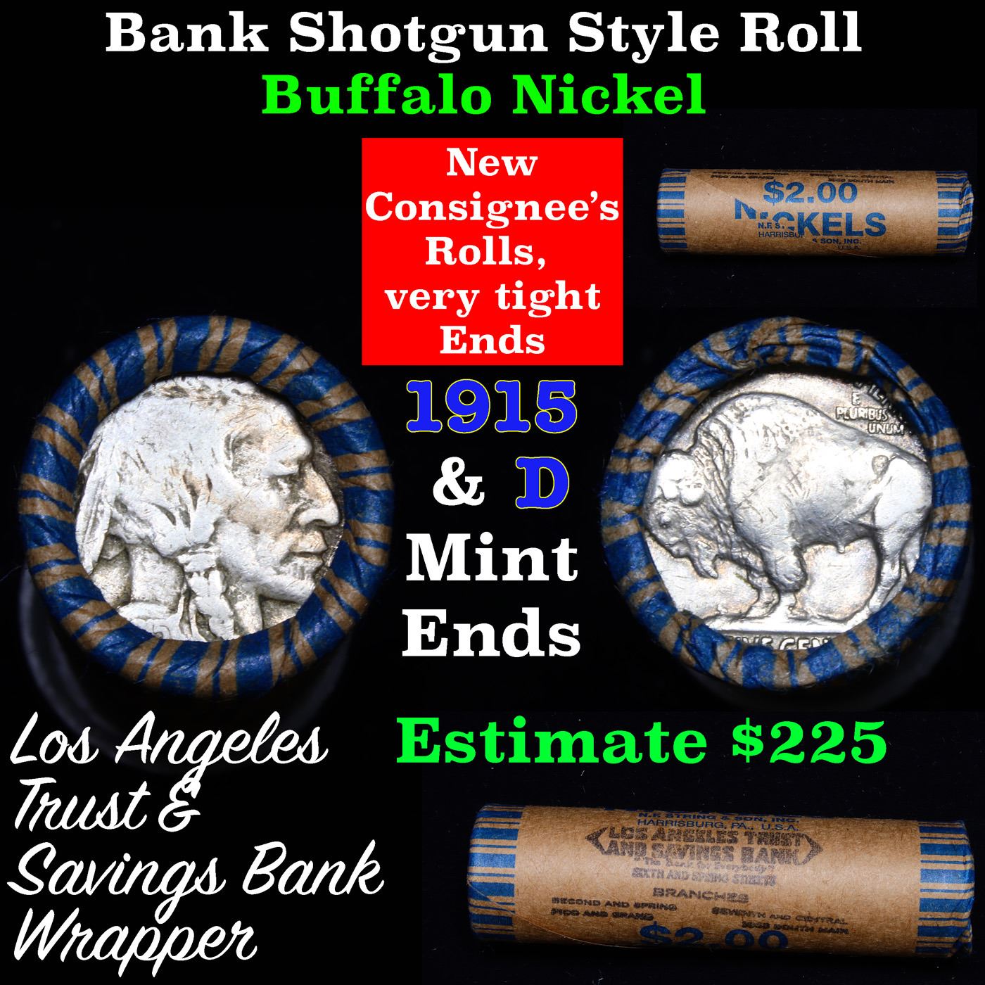 Buffalo Nickel Shotgun Roll in Old Bank Style 'Los Angeles Trust And Savins Bank' Wrapper 1915 & d Mint Ends. The roll is held in an old, rare "Los Angeles Trust And Savings Bank." Bank style wrapper. They are all frrom one Estate. The ends on these rolls are very tight. We will guarantee they are all full dates.