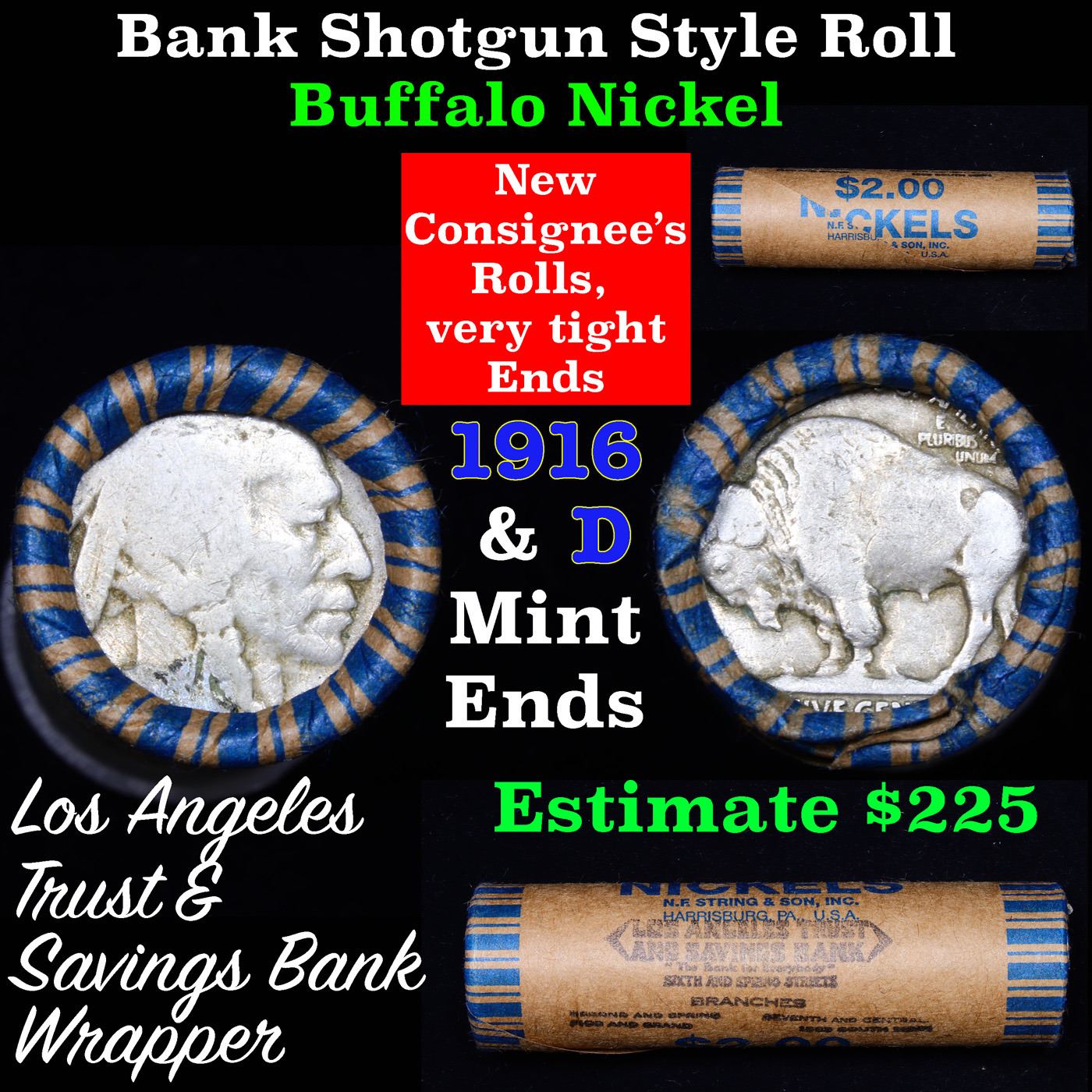 Buffalo Nickel Shotgun Roll in Old Bank Style 'Los Angeles Trust And Savins Bank' Wrapper 1916 & d Mint Ends. The roll is held in an old, rare "Los Angeles Trust And Savings Bank." Bank style wrapper. They are all frrom one Estate. The ends on these rolls are very tight. We will guarantee they are all full dates.