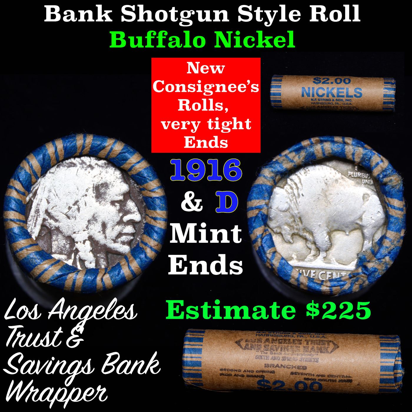Buffalo Nickel Shotgun Roll in Old Bank Style 'Los Angeles Trust And Savins Bank' Wrapper 1916 & d Mint Ends. The roll is held in an old, rare "Los Angeles Trust And Savings Bank." Bank style wrapper. They are all frrom one Estate. The ends on these rolls are very tight. We will guarantee they are all full dates.