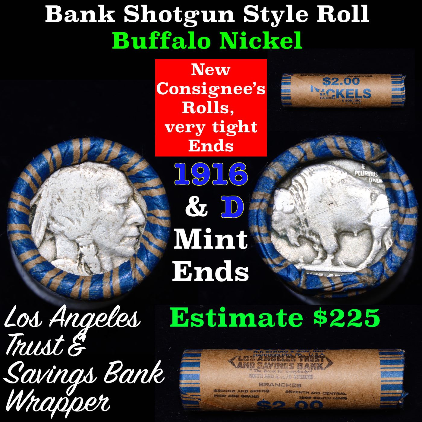 Buffalo Nickel Shotgun Roll in Old Bank Style 'Los Angeles Trust And Savins Bank' Wrapper 1916 & d Mint Ends. The roll is held in an old, rare "Los Angeles Trust And Savings Bank." Bank style wrapper. They are all frrom one Estate. The ends on these rolls are very tight. We will guarantee they are all full dates.