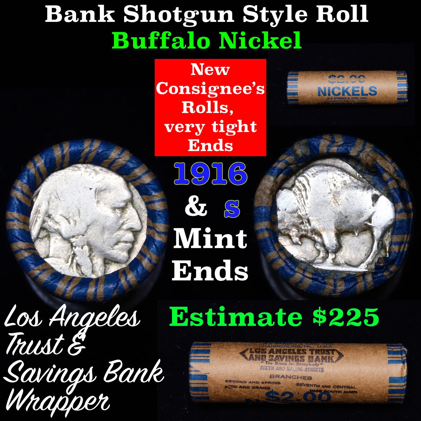 Buffalo Nickel Shotgun Roll in Old Bank Style 'Los Angeles Trust And Savins Bank' Wrapper 1916 & s Mint Ends. The roll is held in an old, rare "Los Angeles Trust And Savings Bank." Bank style wrapper. They are all frrom one Estate. The ends on these rolls are very tight. We will guarantee they are all full dates.