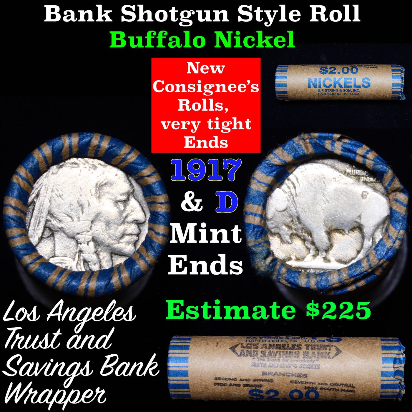 Buffalo Nickel Shotgun Roll in Old Bank Style 'Los Angeles Trust And Savins Bank' Wrapper 1917 & d Mint Ends. The roll is held in an old, rare "Los Angeles Trust And Savings Bank." Bank style wrapper. They are all frrom one Estate. The ends on these rolls are very tight. We will guarantee they are all full dates.