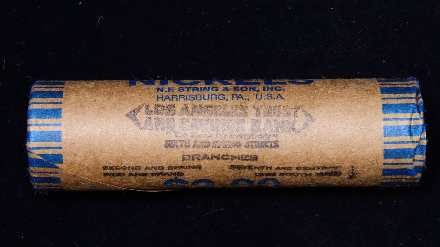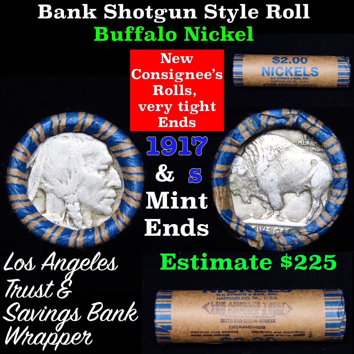 Buffalo Nickel Shotgun Roll in Old Bank Style 'Los Angeles Trust And Savins Bank'  Wrapper 1917 & s Mint Ends.        The roll is held in an old, rare "Los Angeles Trust And Savings Bank." Bank style wrapper.  They are all frrom one Estate. The ends on these rolls are very tight. We will guarantee they are all full dates.