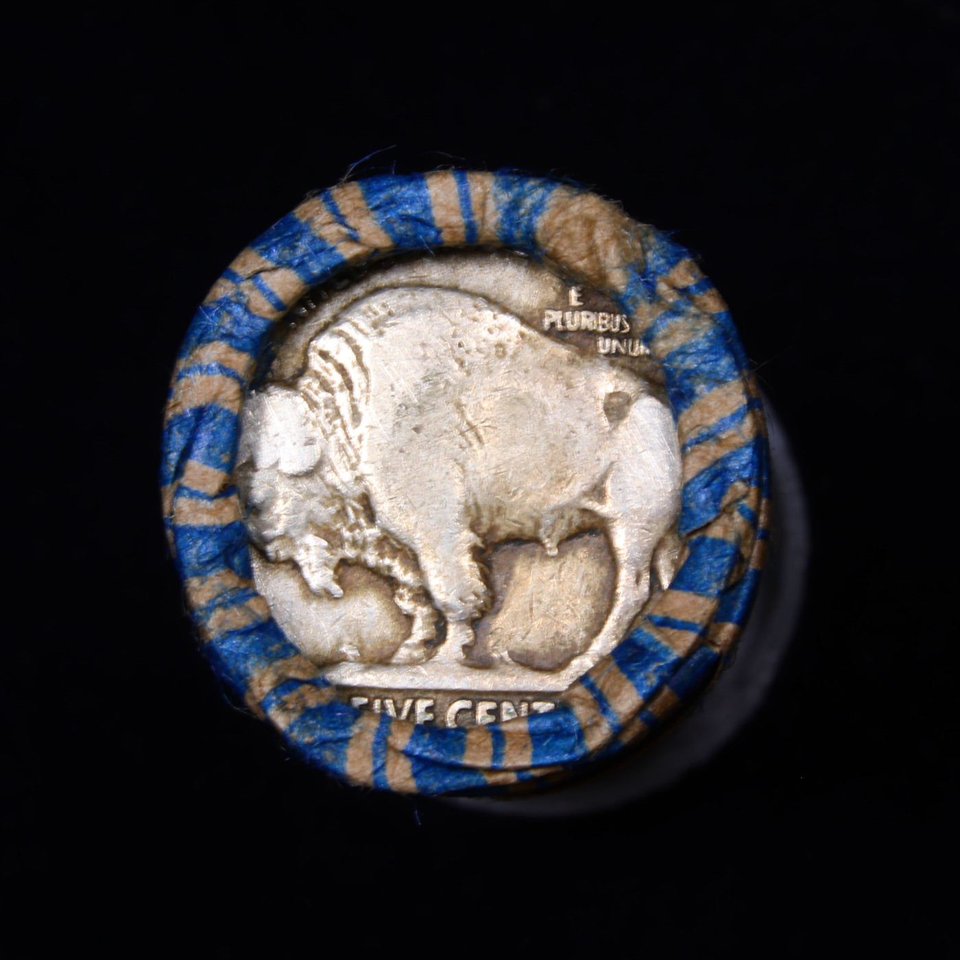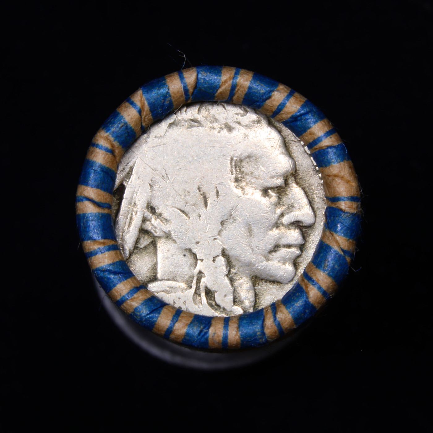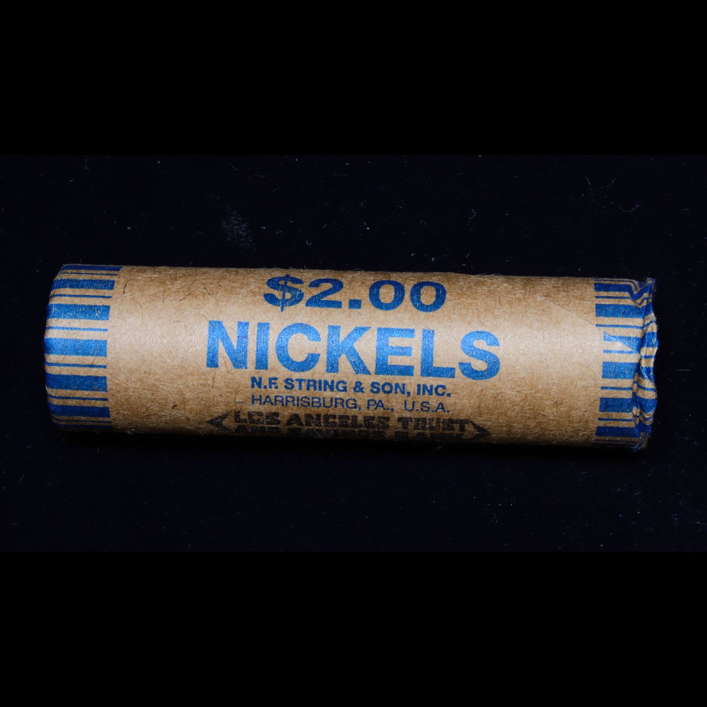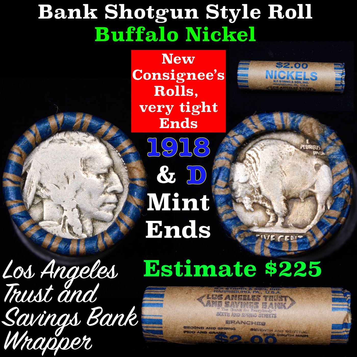 Buffalo Nickel Shotgun Roll in Old Bank Style 'Los Angeles Trust And Savins Bank' Wrapper 1918 & d Mint Ends. The roll is held in an old, rare "Los Angeles Trust And Savings Bank." Bank style wrapper. They are all frrom one Estate. The ends on these rolls are very tight. We will guarantee they are all full dates.