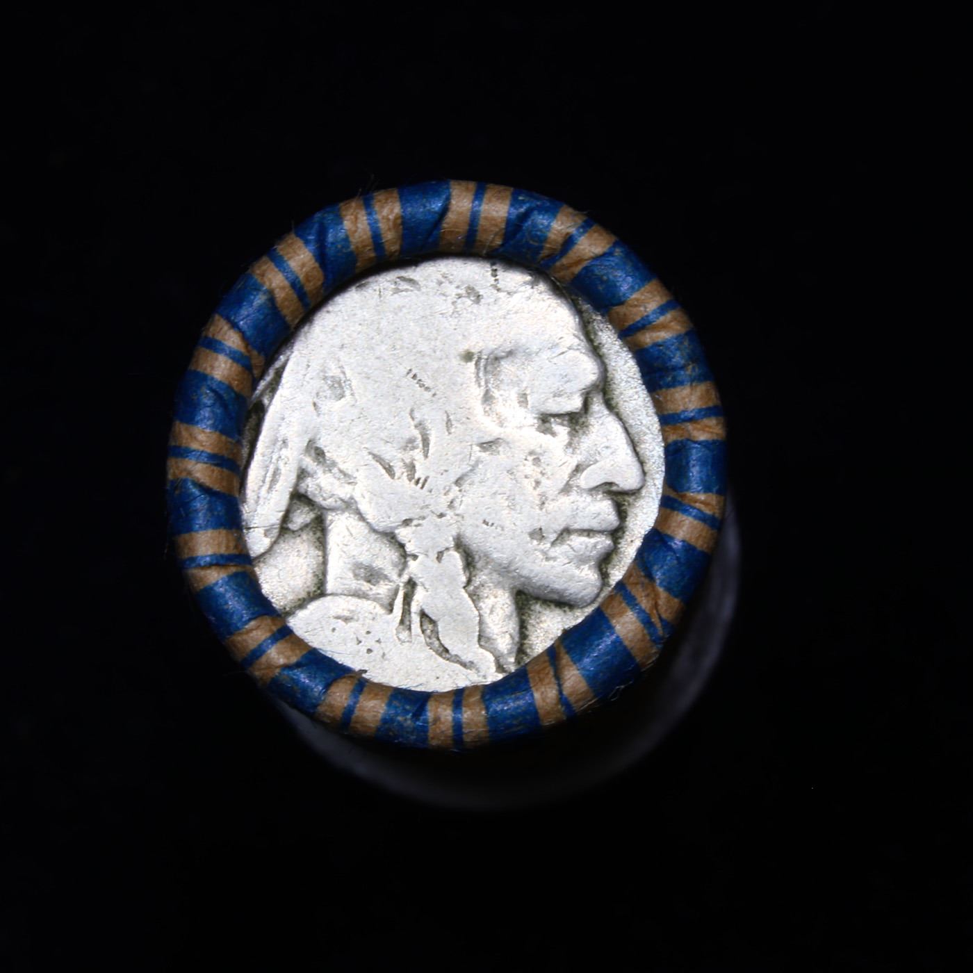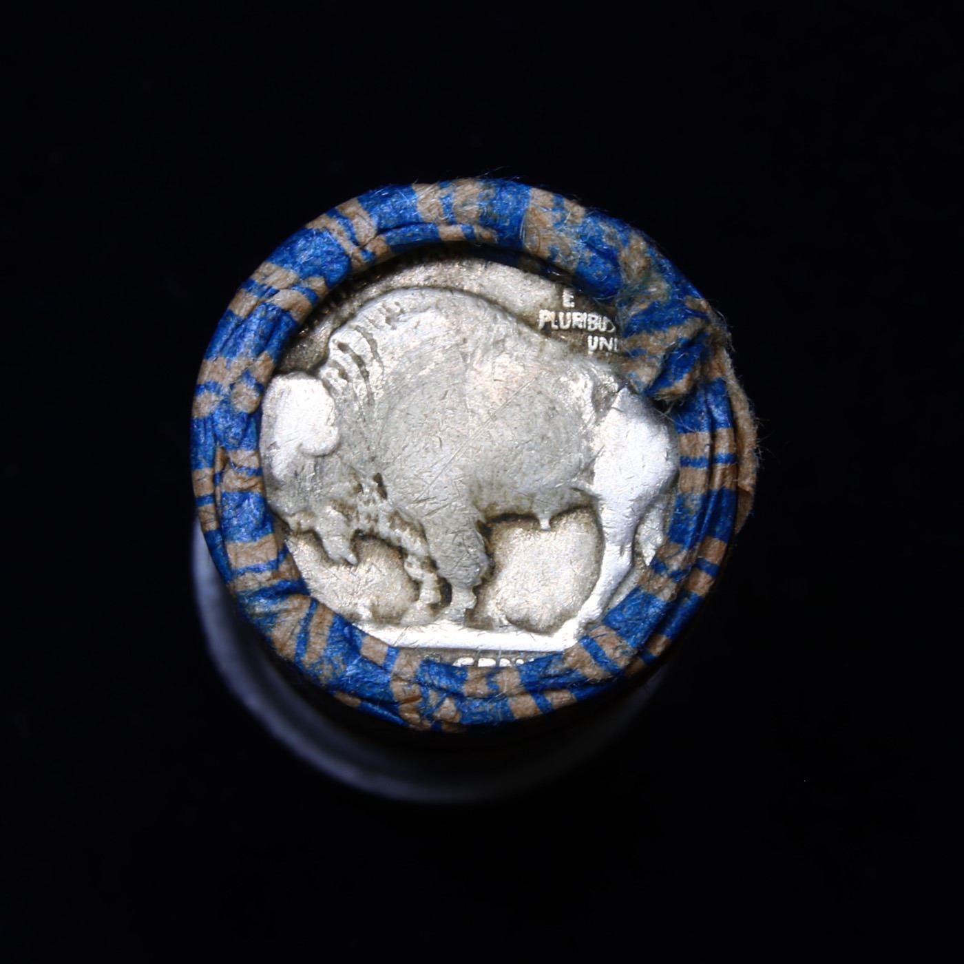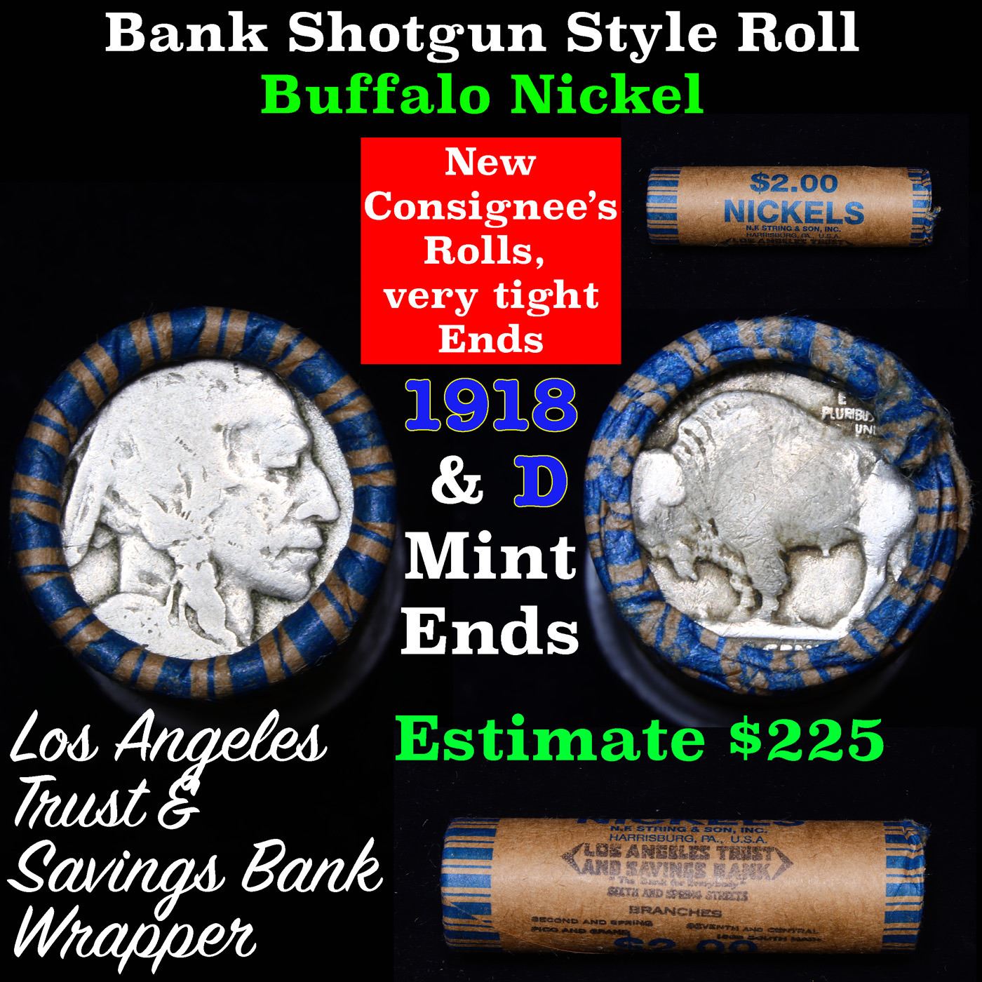 Buffalo Nickel Shotgun Roll in Old Bank Style 'Los Angeles Trust And Savins Bank' Wrapper 1918 & d Mint Ends. The roll is held in an old, rare "Los Angeles Trust And Savings Bank." Bank style wrapper. They are all frrom one Estate. The ends on these rolls are very tight. We will guarantee they are all full dates.