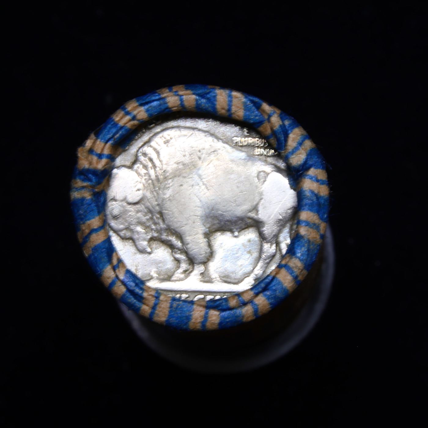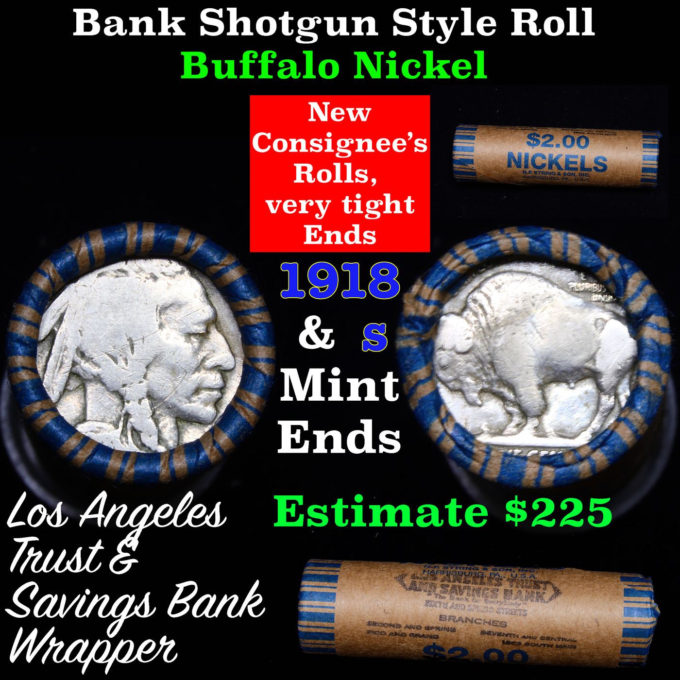 Buffalo Nickel Shotgun Roll in Old Bank Style 'Los Angeles Trust And Savins Bank' Wrapper 1918 & s Mint Ends. The roll is held in an old, rare "Los Angeles Trust And Savings Bank." Bank style wrapper. They are all frrom one Estate. The ends on these rolls are very tight. We will guarantee they are all full dates.