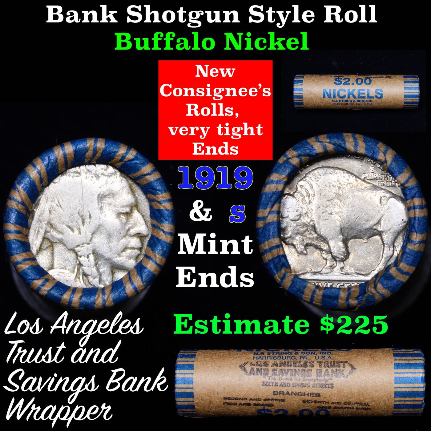 Buffalo Nickel Shotgun Roll in Old Bank Style 'Los Angeles Trust And Savins Bank' Wrapper 1919 & s Mint Ends. The roll is held in an old, rare "Los Angeles Trust And Savings Bank." Bank style wrapper. They are all frrom one Estate. The ends on these rolls are very tight. We will guarantee they are all full dates.