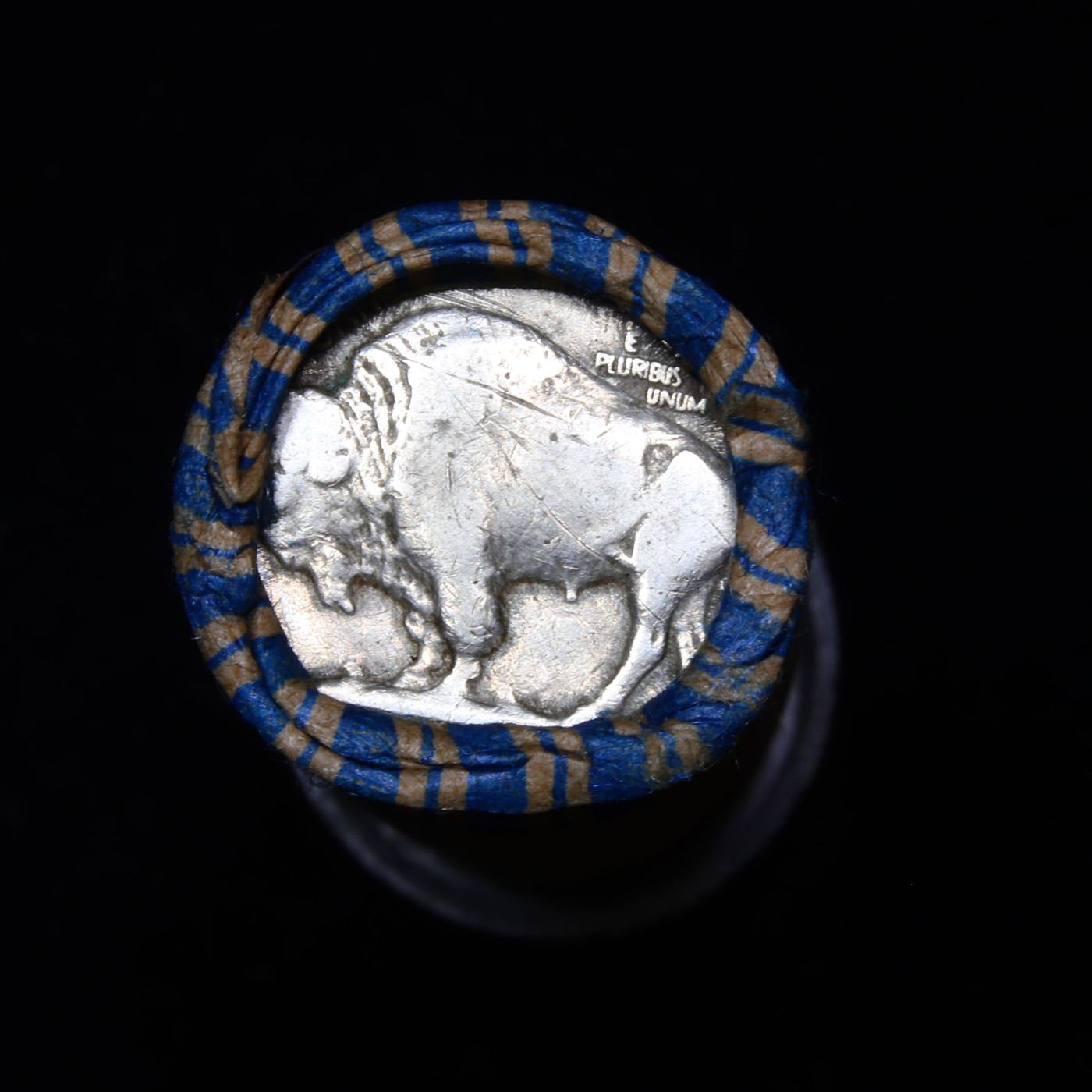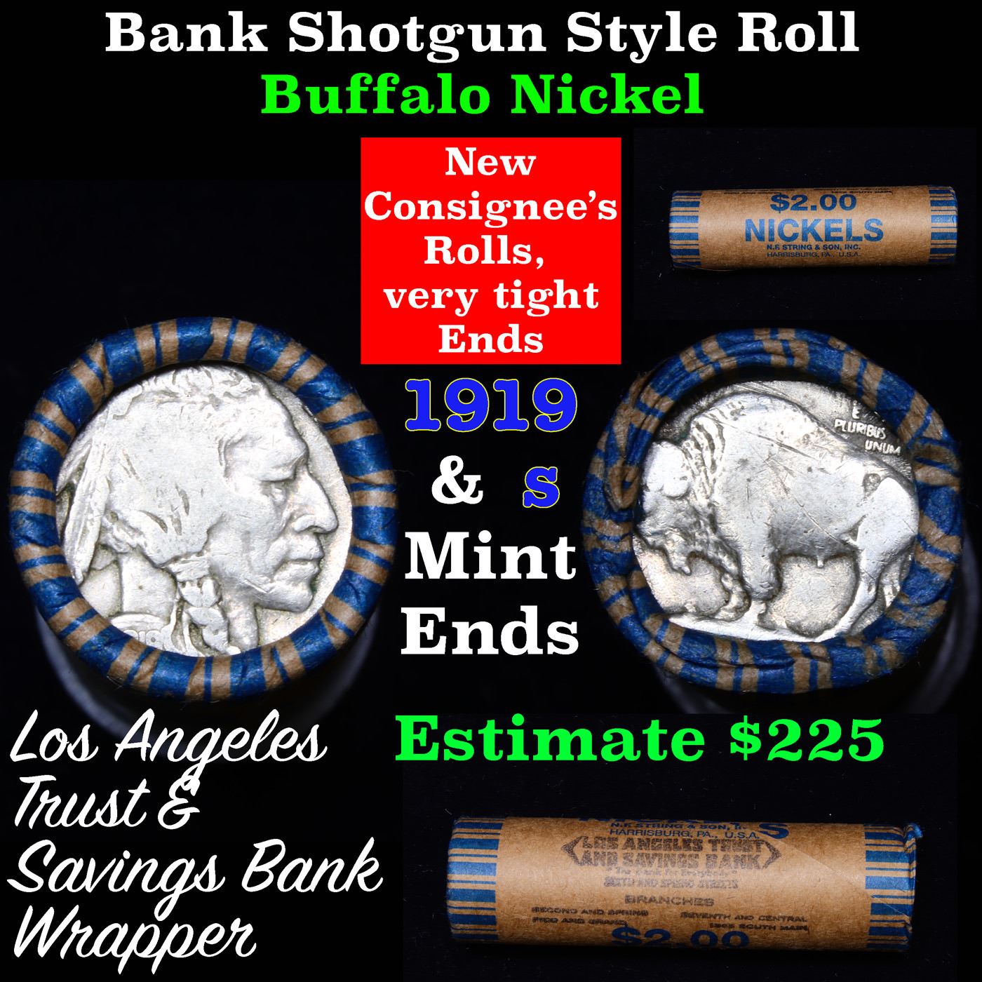 Buffalo Nickel Shotgun Roll in Old Bank Style 'Los Angeles Trust And Savins Bank' Wrapper 1919 & s Mint Ends. The roll is held in an old, rare "Los Angeles Trust And Savings Bank." Bank style wrapper. They are all frrom one Estate. The ends on these rolls are very tight. We will guarantee they are all full dates.