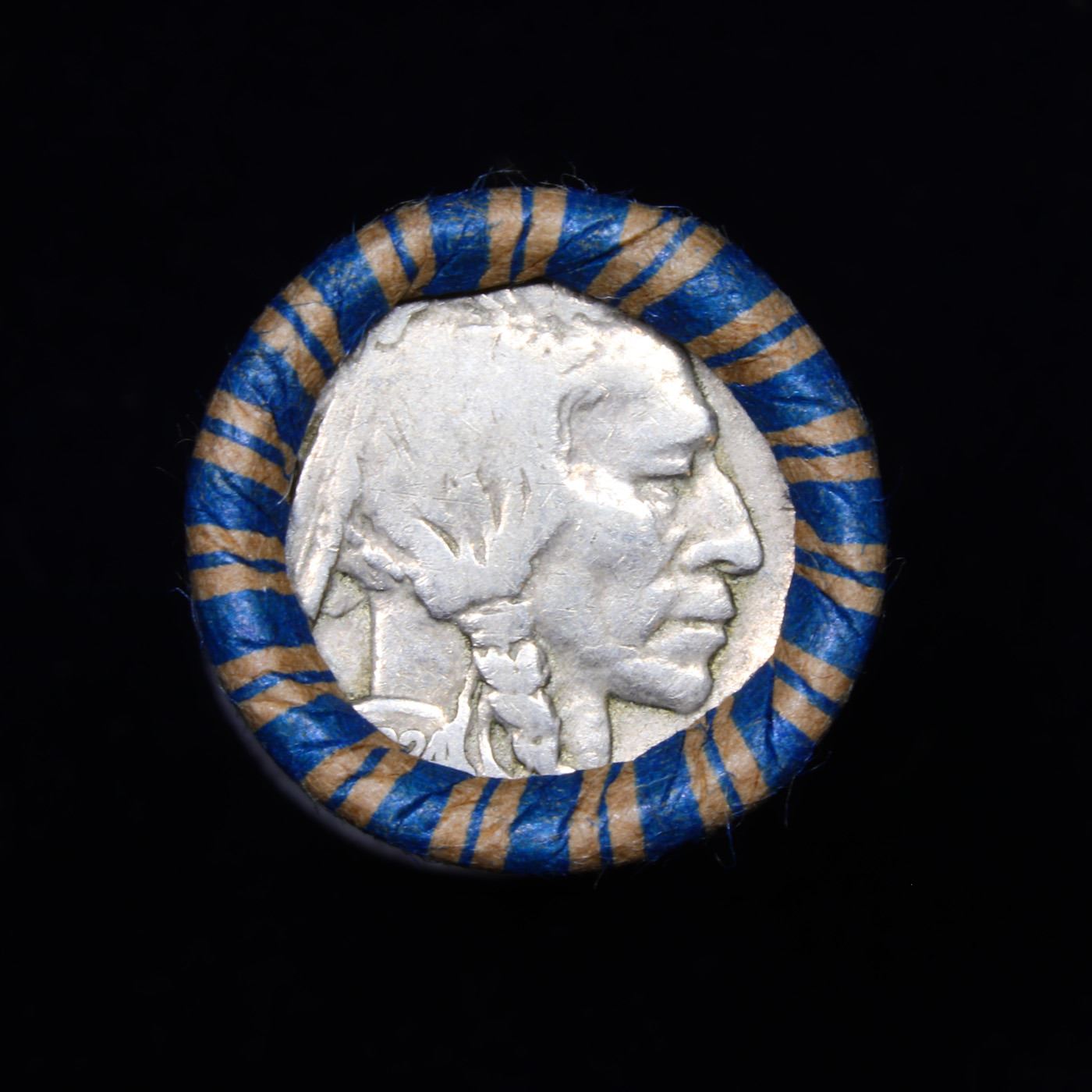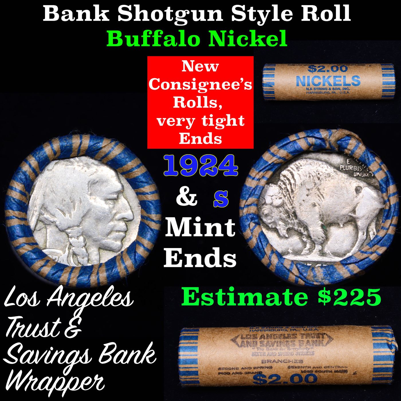 Buffalo Nickel Shotgun Roll in Old Bank Style 'Los Angeles Trust And Savins Bank' Wrapper 1924 & s Mint Ends. The roll is held in an old, rare "Los Angeles Trust And Savings Bank." Bank style wrapper. They are all frrom one Estate. The ends on these rolls are very tight. We will guarantee they are all full dates.