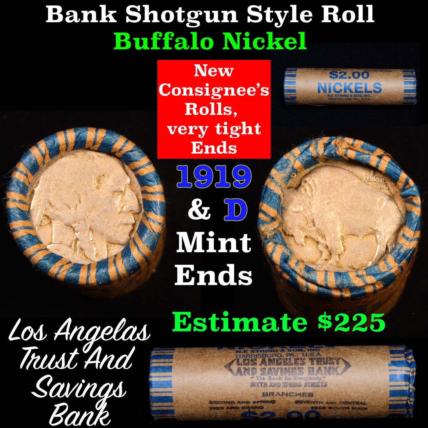 Buffalo Nickel Shotgun Roll in Old Bank Style 'Los Angeles Trust & Savings Bank' Wrapper 1919 & d Mint Ends Grades. The roll is held in an old, rare "Los Angeles Trust and Savings Bank" wrapper. The Bank for Everyone. Sixth & Spring Streets. They are all frrom one Estate. The ends on these rolls are very tight. We will guarantee they are all full dates.