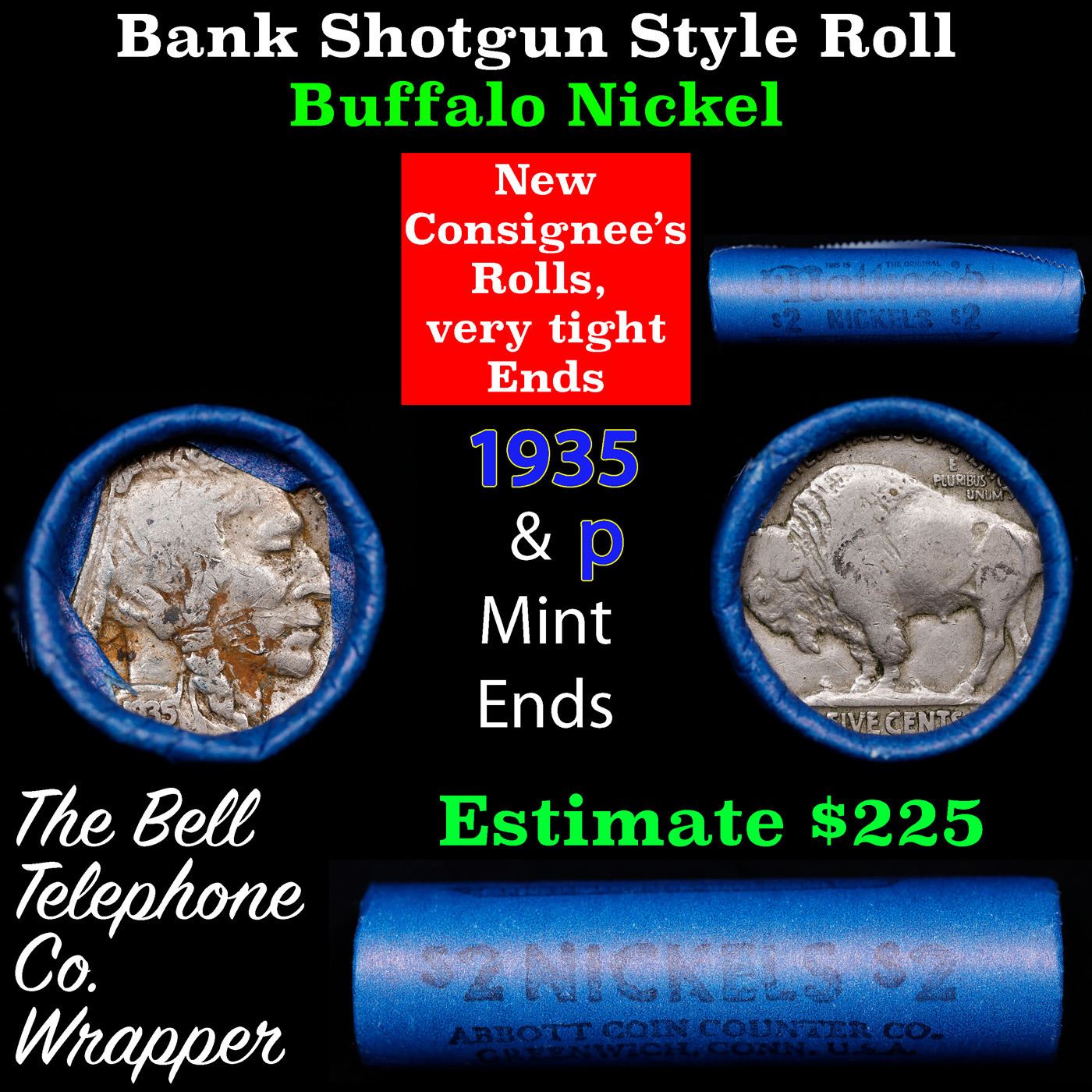 Buffalo Nickel Shotgun Roll in Old Bank Style 'Nathan's' Wrapper 1935 & p Mint Ends. The roll is held in an old, rare "Brandt Abbott Coin Counter" Bank style wrapper. They are all from one estate, the ends on these rolls are very tight. We will guarantee they are all full dates.