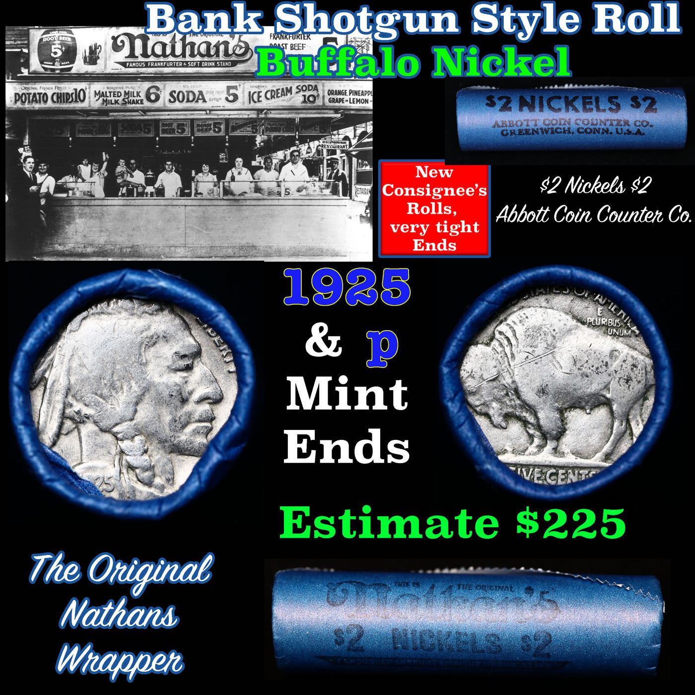 Buffalo Nickel Shotgun Roll in Old Bank Style 'Nathans' Wrapper 1925 & p Mint Ends. The roll is held in an old, rare "Brandt Abbott Coin Counter" Bank style wrapper. They are all from one estate, the ends on these rolls are very tight. We will guarantee they are all full dates.