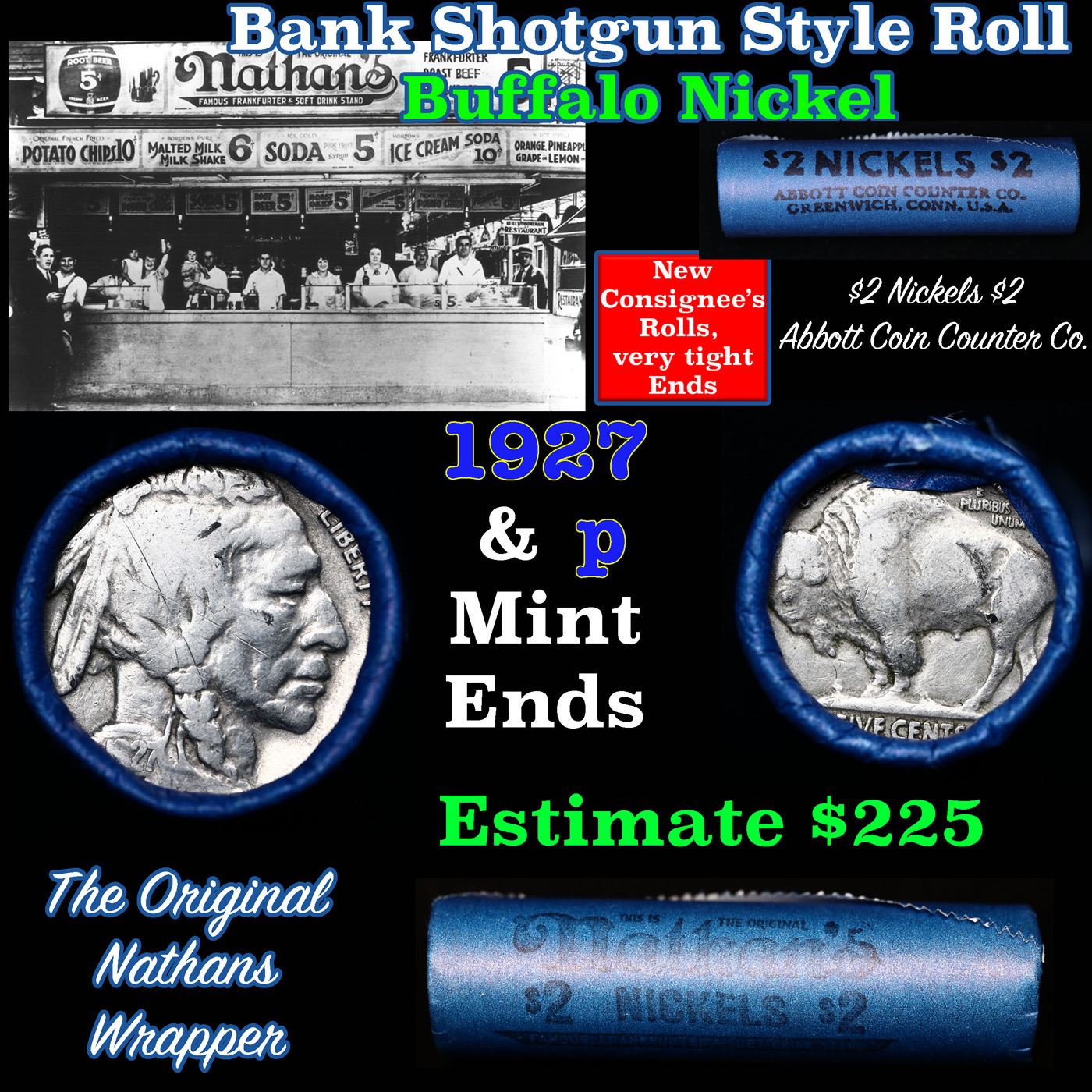 Buffalo Nickel Shotgun Roll in Old Bank Style 'Nathans' Wrapper 19273 & p Mint Ends. The roll is held in an old, rare "Brandt Abbott Coin Counter" Bank style wrapper. They are all from one estate, the ends on these rolls are very tight. We will guarantee they are all full dates.