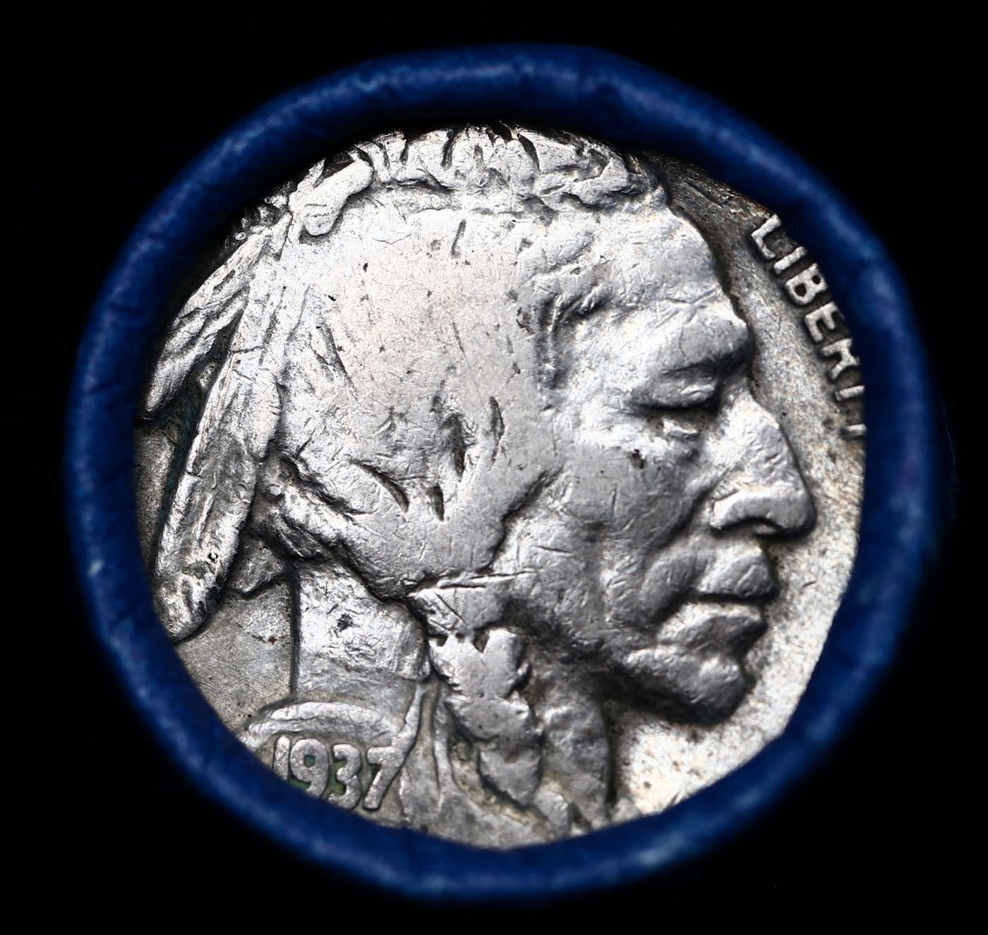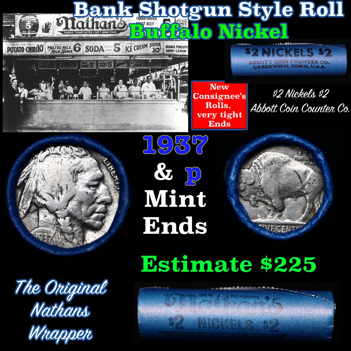 Buffalo Nickel Shotgun Roll in Old Bank Style 'Nathans' Wrapper 1937 & p Mint Ends. The roll is held in an old, rare "Brandt Abbott Coin Counter" Bank style wrapper. They are all from one estate, the ends on these rolls are very tight. We will guarantee they are all full dates.