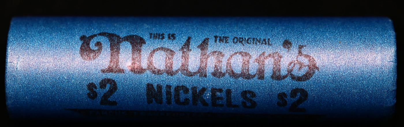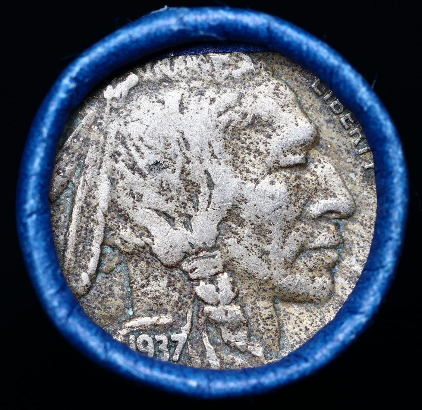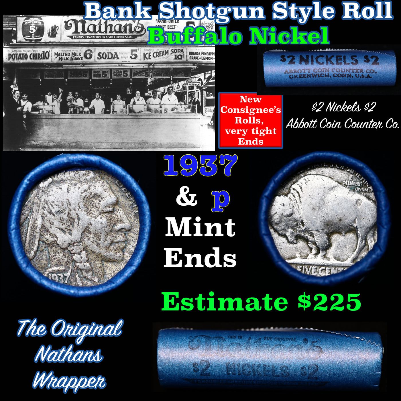 Buffalo Nickel Shotgun Roll in Old Bank Style 'Nathens' Wrapper 1937 & p Mint Ends. The roll is held in an old, rare "Brandt Abbott Coin Counter" Bank style wrapper. They are all from one estate, the ends on these rolls are very tight. We will guarantee they are all full dates.