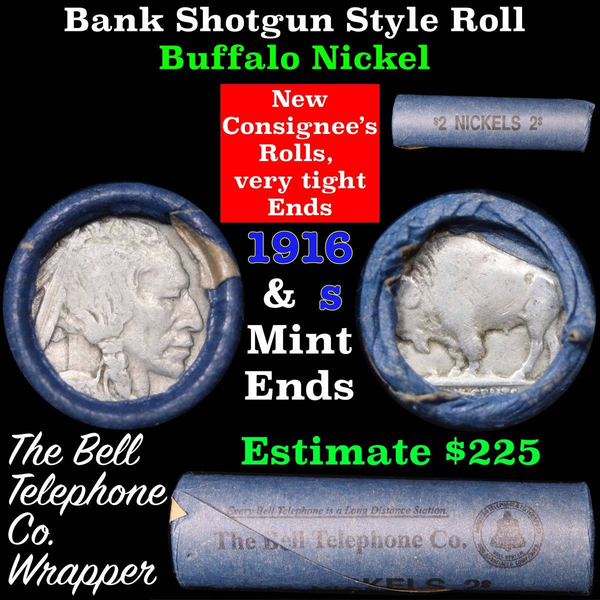 Buffalo Nickel Shotgun Roll in Old Bank Style Wrapper 1916 & s Mint Ends . . Grades. The roll is held in an old, rare Bank style wrapper. They are all frrom one Estate. The ends on these rolls are very tight. We will guarantee they are all full dates.