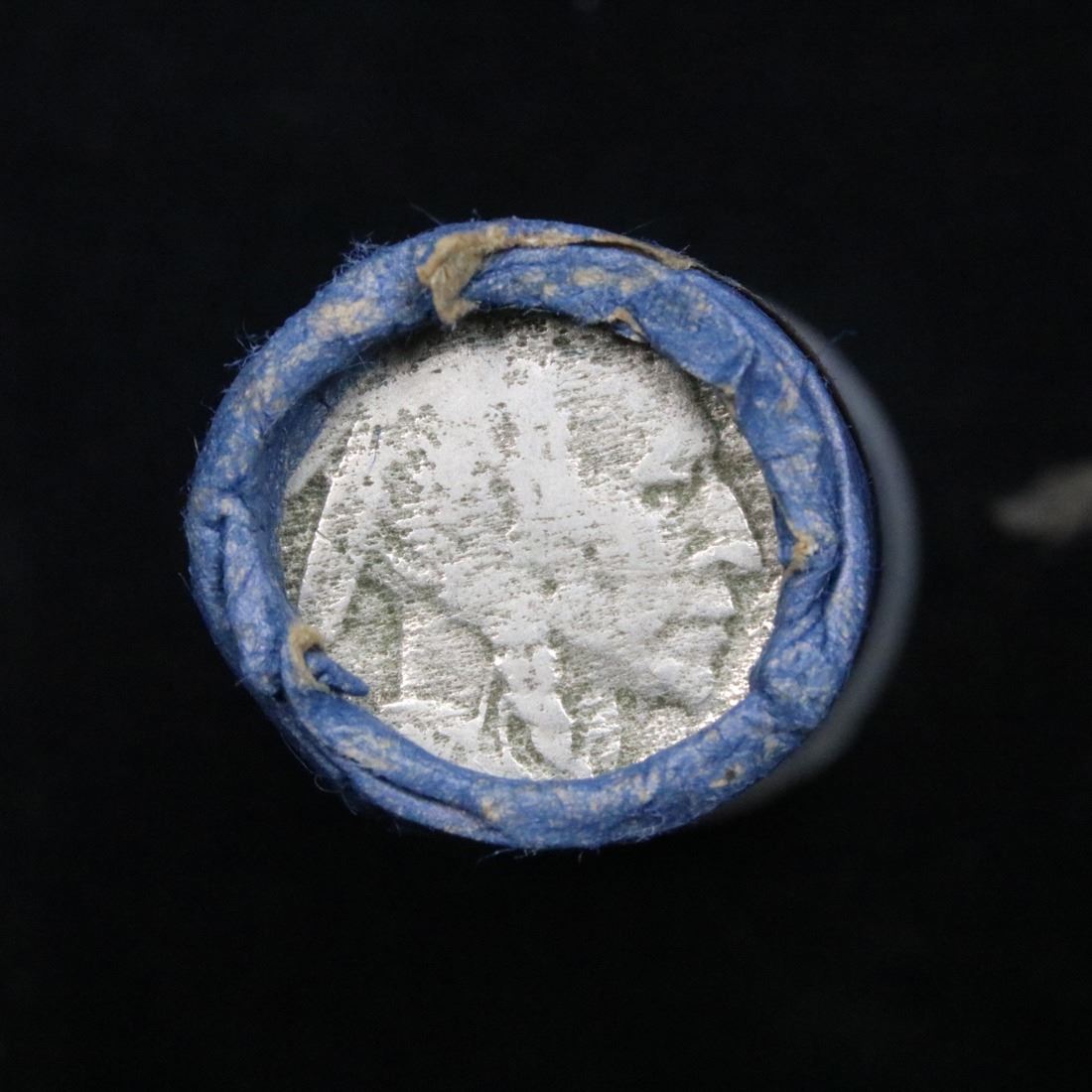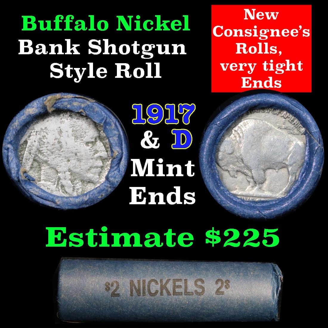 Buffalo Nickel Shotgun Roll in Old Bank Style Wrapper 1917 & d Mint Ends. The roll is held in an old, rare Bank style wrapper. They are all frrom one Estate. The ends on these rolls are very tight. We will guarantee they are all full dates.