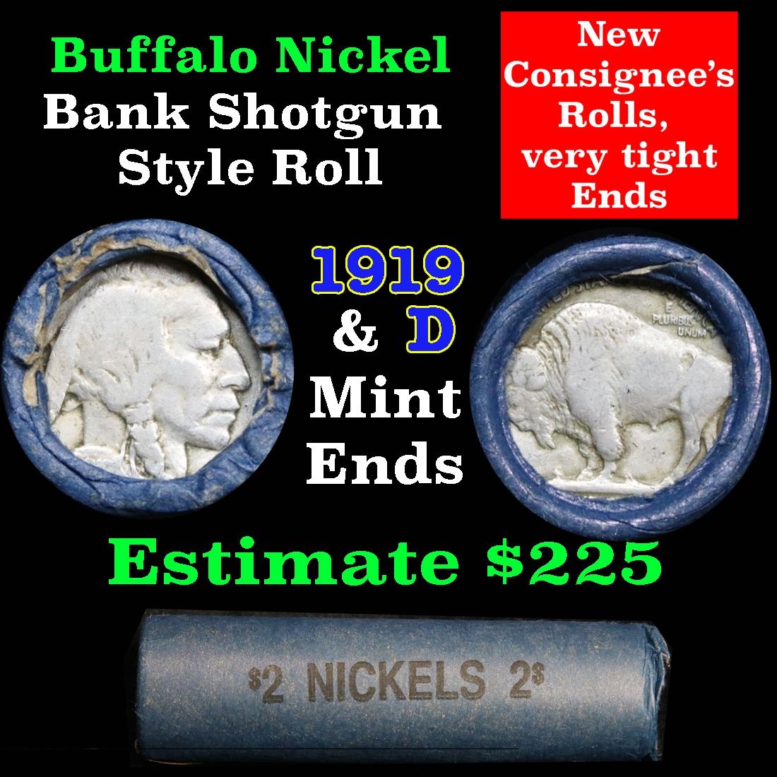 Buffalo Nickel Shotgun Roll in Old Bank Style Wrapper 1919 & d Mint Ends. The roll is held in an old, rare Bank style wrapper. They are all frrom one Estate. The ends on these rolls are very tight. We will guarantee they are all full dates.