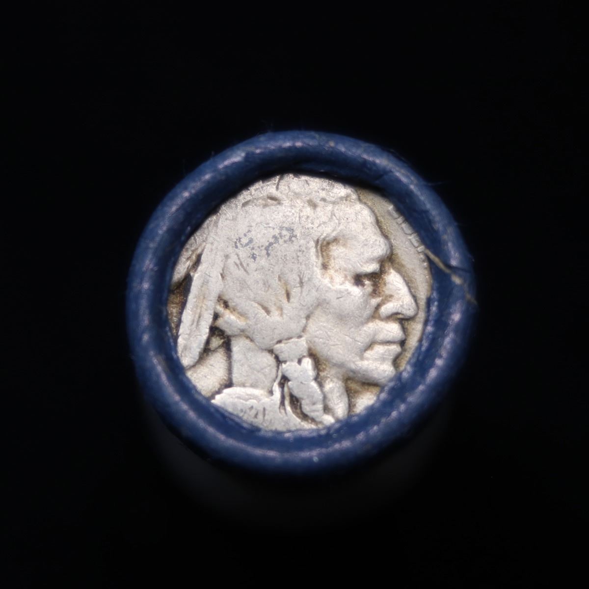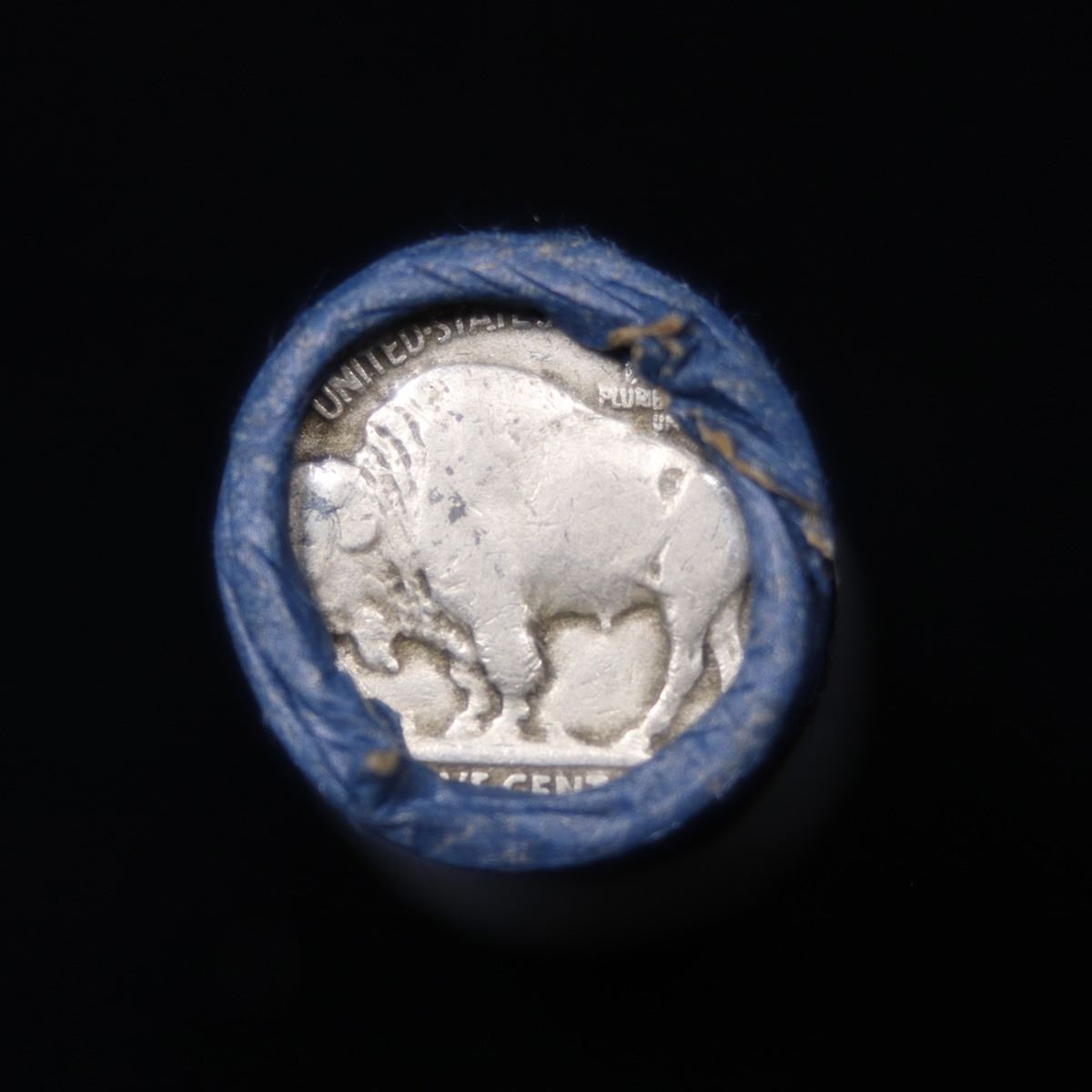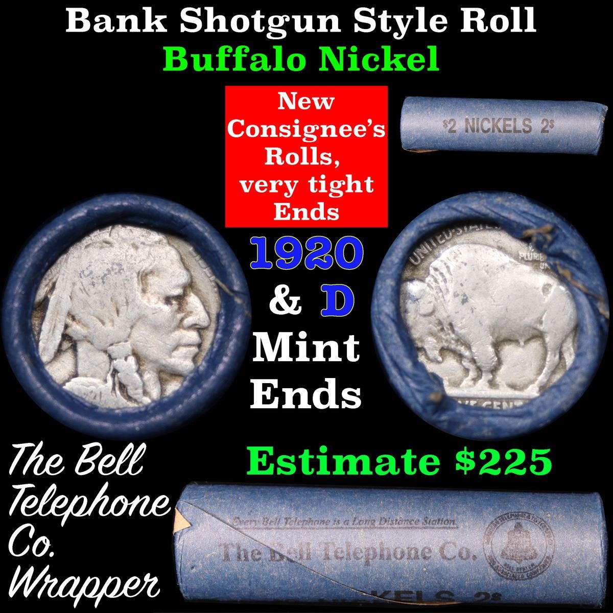 Buffalo Nickel Shotgun Roll in Old Bank Style Wrapper 1920 & d Mint Ends . . Grades. The roll is held in an old, rare Bank style wrapper. They are all frrom one Estate. The ends on these rolls are very tight. We will guarantee they are all full dates.