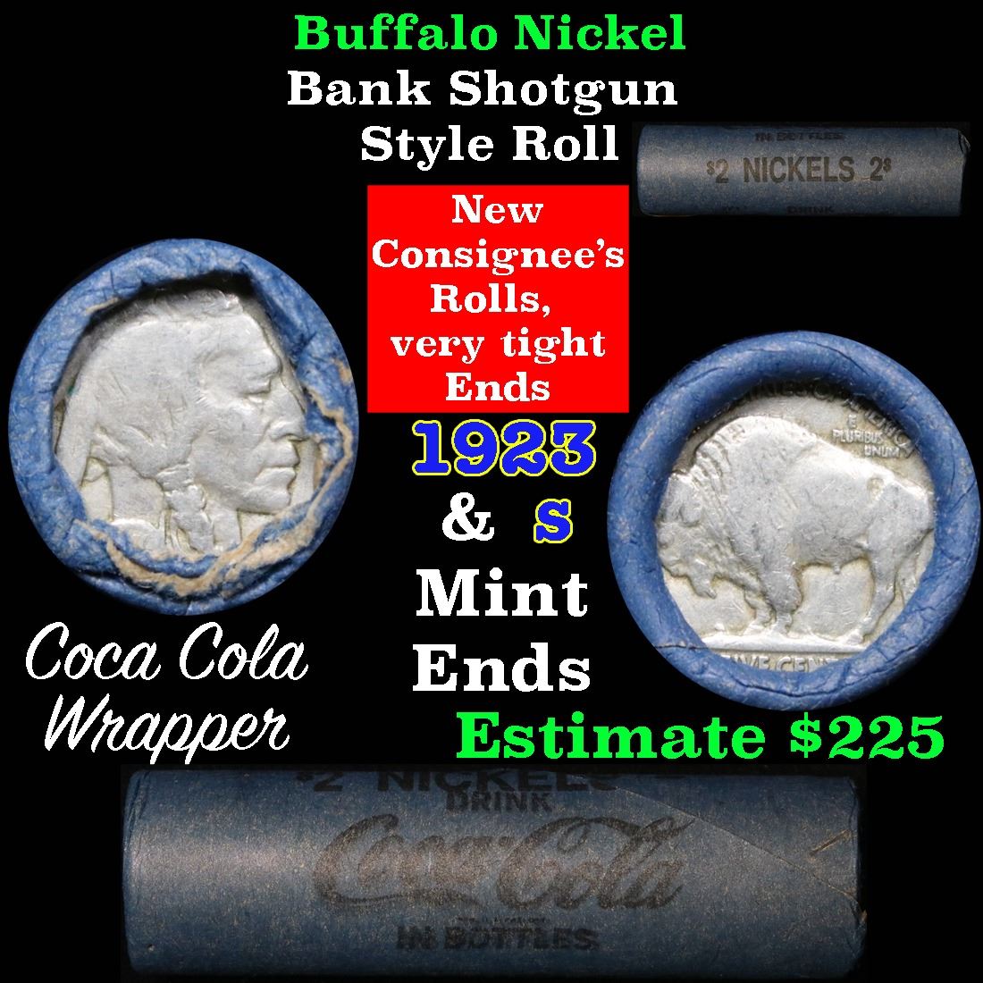 Buffalo Nickel Shotgun Roll in Old Bank Style Wrapper 1923 & s Mint Ends. The roll is held in an old, rare Bank style wrapper. They are all frrom one Estate. The ends on these rolls are very tight. We will guarantee they are all full dates.