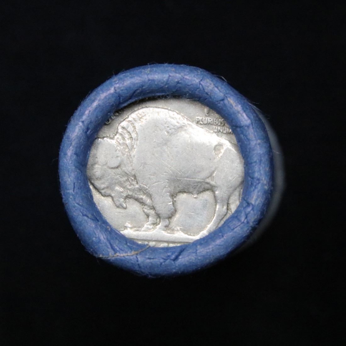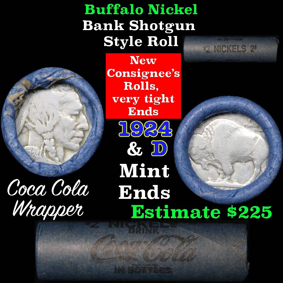 Buffalo Nickel Shotgun Roll in Old Bank Style Wrapper 1924 & d Mint Ends. The roll is held in an old, rare Bank style wrapper. They are all frrom one Estate. The ends on these rolls are very tight. We will guarantee they are all full dates.