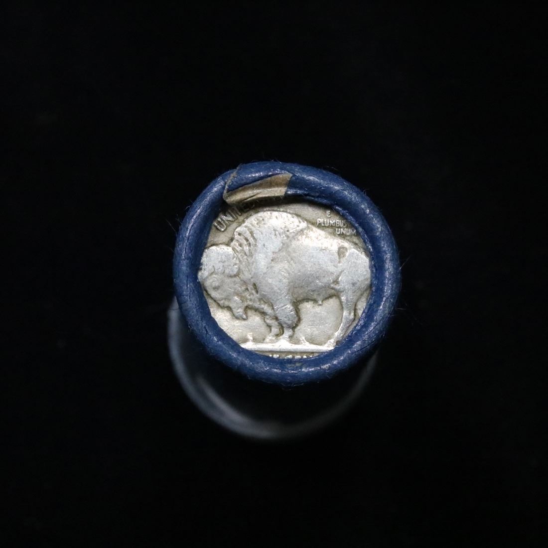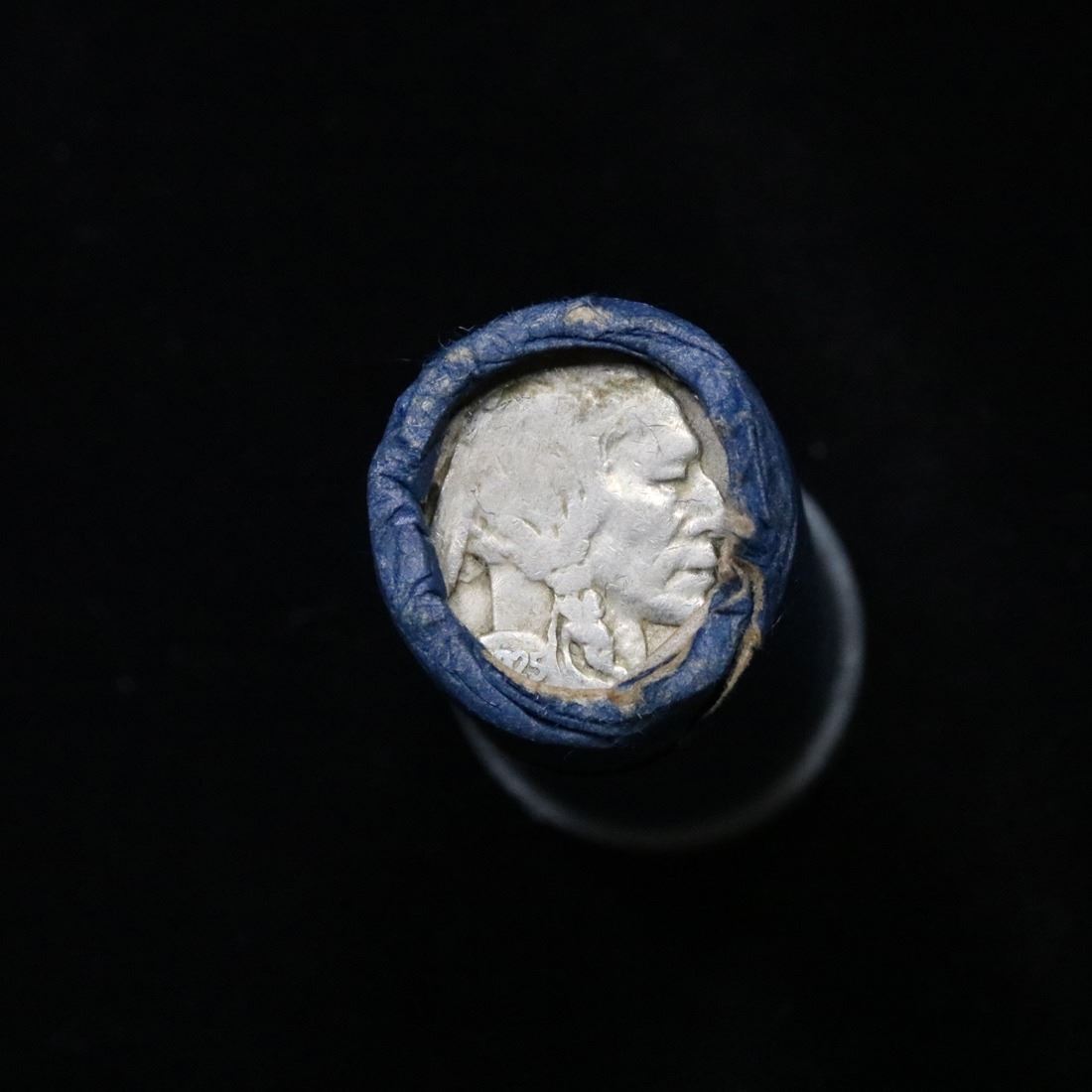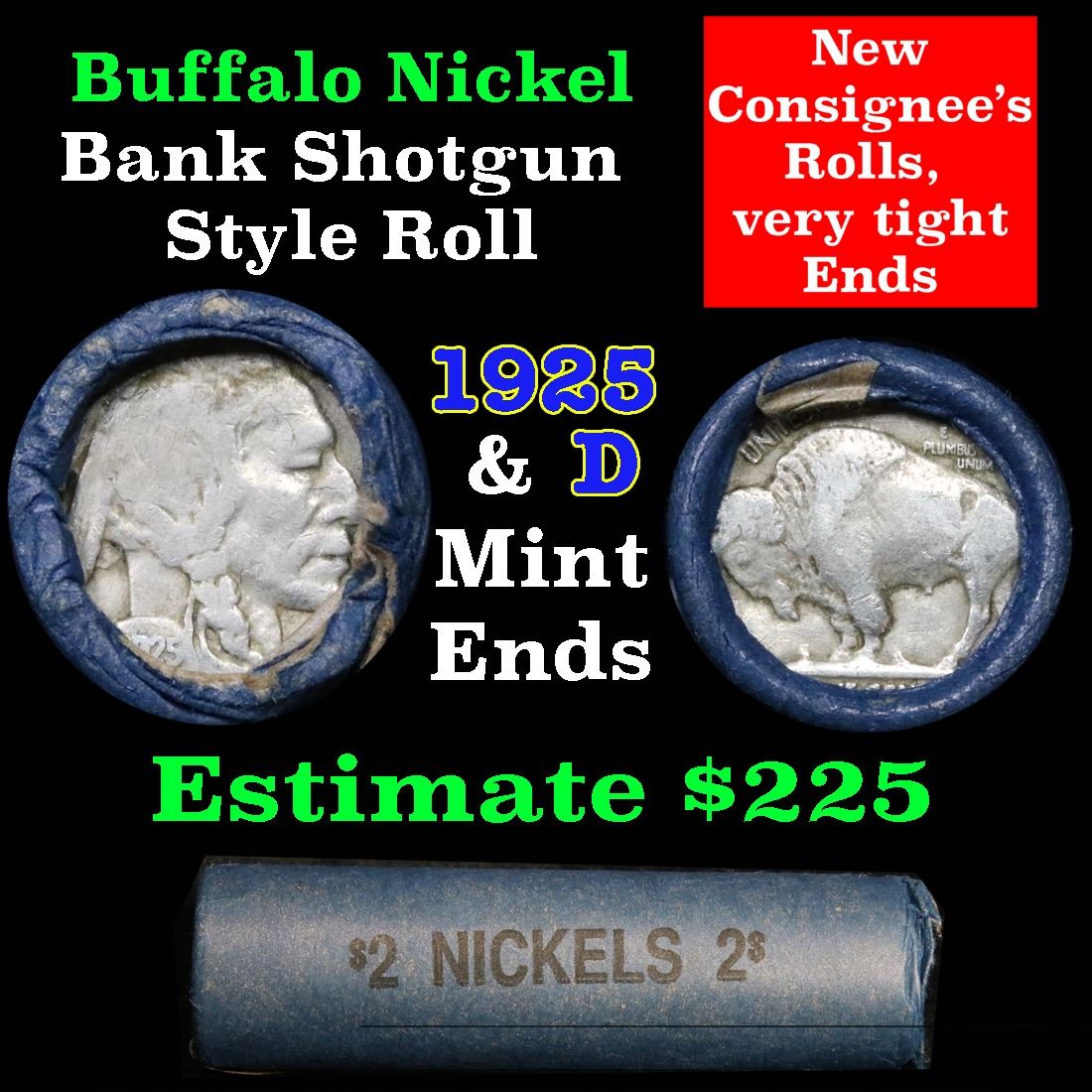 Buffalo Nickel Shotgun Roll in Old Bank Style Wrapper 1925 & d Mint Ends. The roll is held in an old, rare Bank style wrapper. They are all frrom one Estate. The ends on these rolls are very tight. We will guarantee they are all full dates.