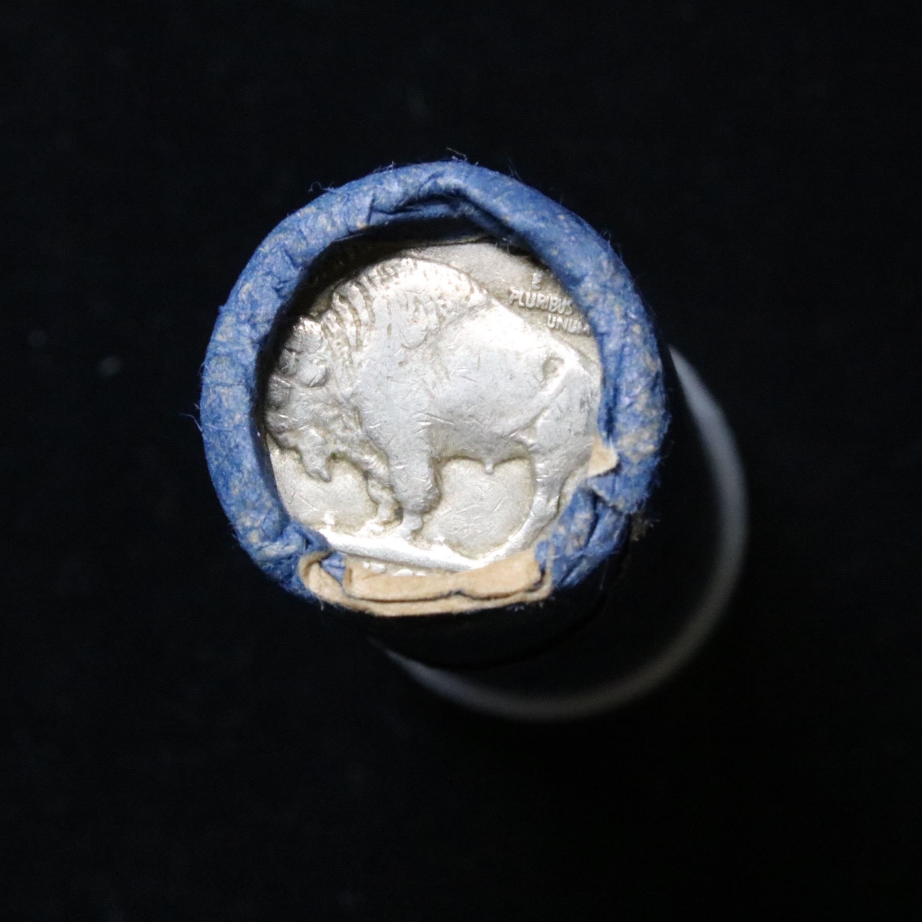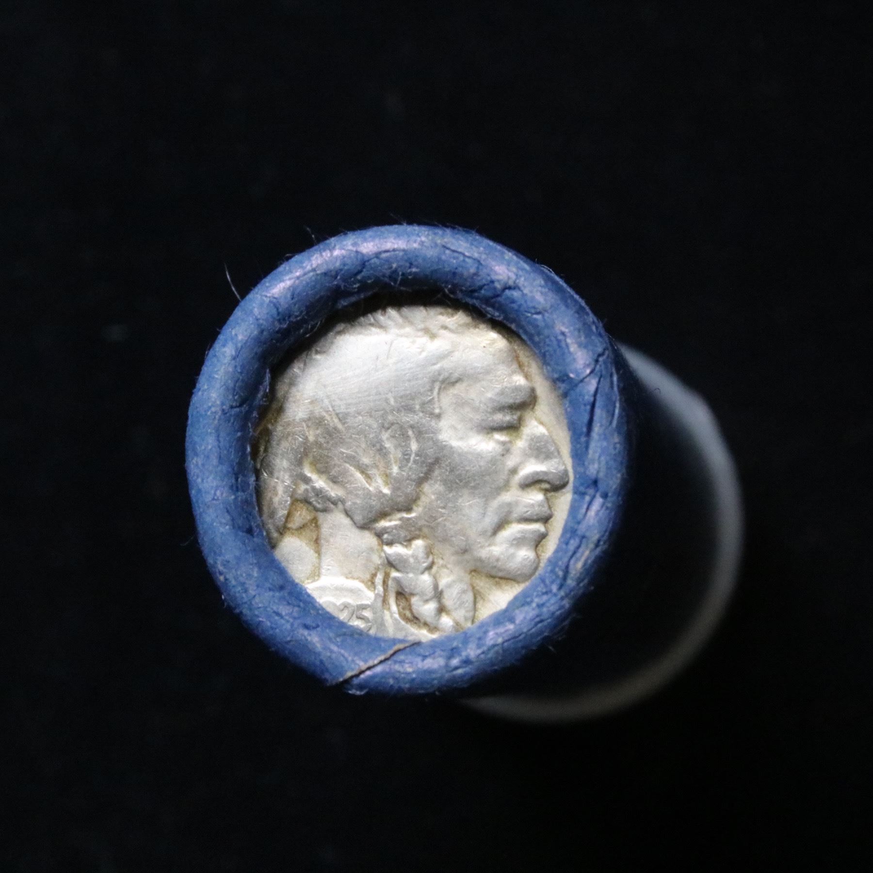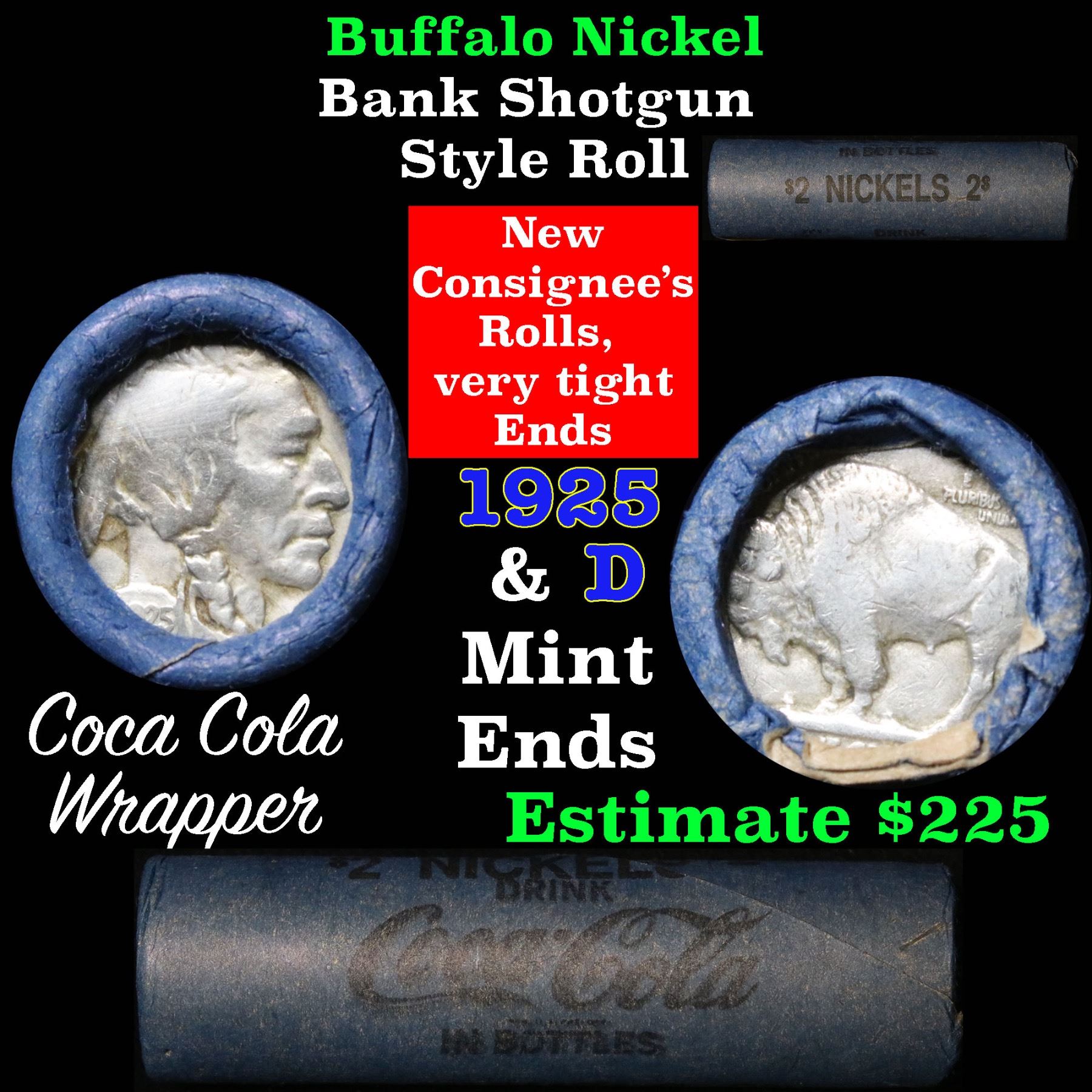 Buffalo Nickel Shotgun Roll in Old Bank Style Wrapper 1925 & d Mint Ends. The roll is held in an old, rare Bank style wrapper. They are all frrom one Estate. The ends on these rolls are very tight. We will guarantee they are all full dates.