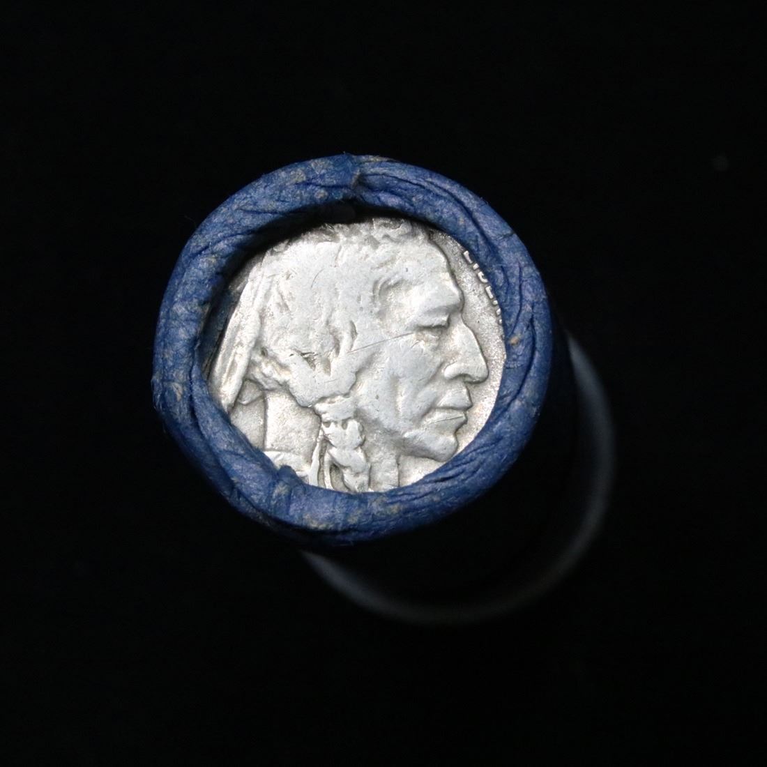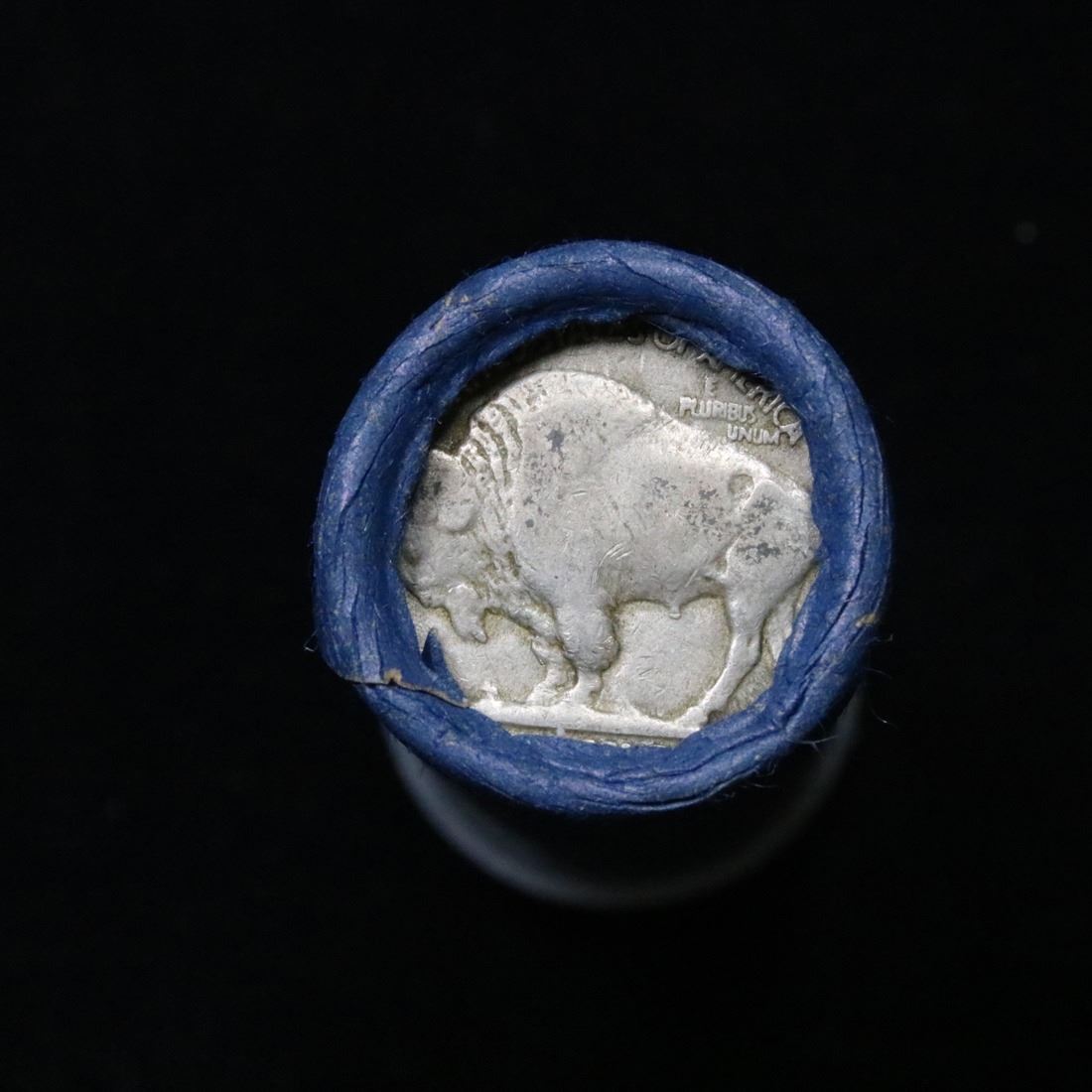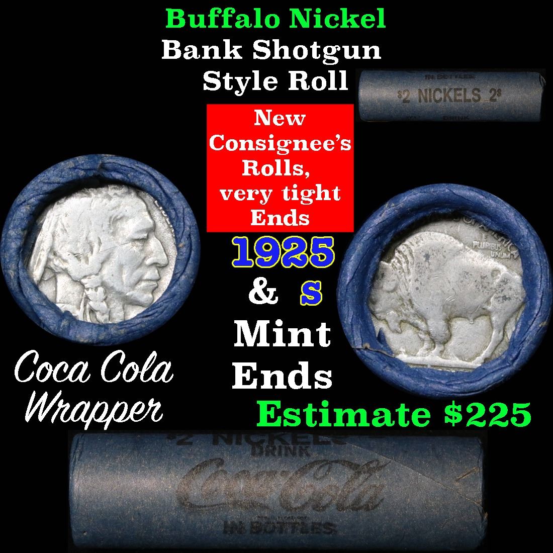 Buffalo Nickel Shotgun Roll in Old Bank Style Wrapper 1925 & s Mint Ends. The roll is held in an old, rare Bank style wrapper. They are all frrom one Estate. The ends on these rolls are very tight. We will guarantee they are all full dates.