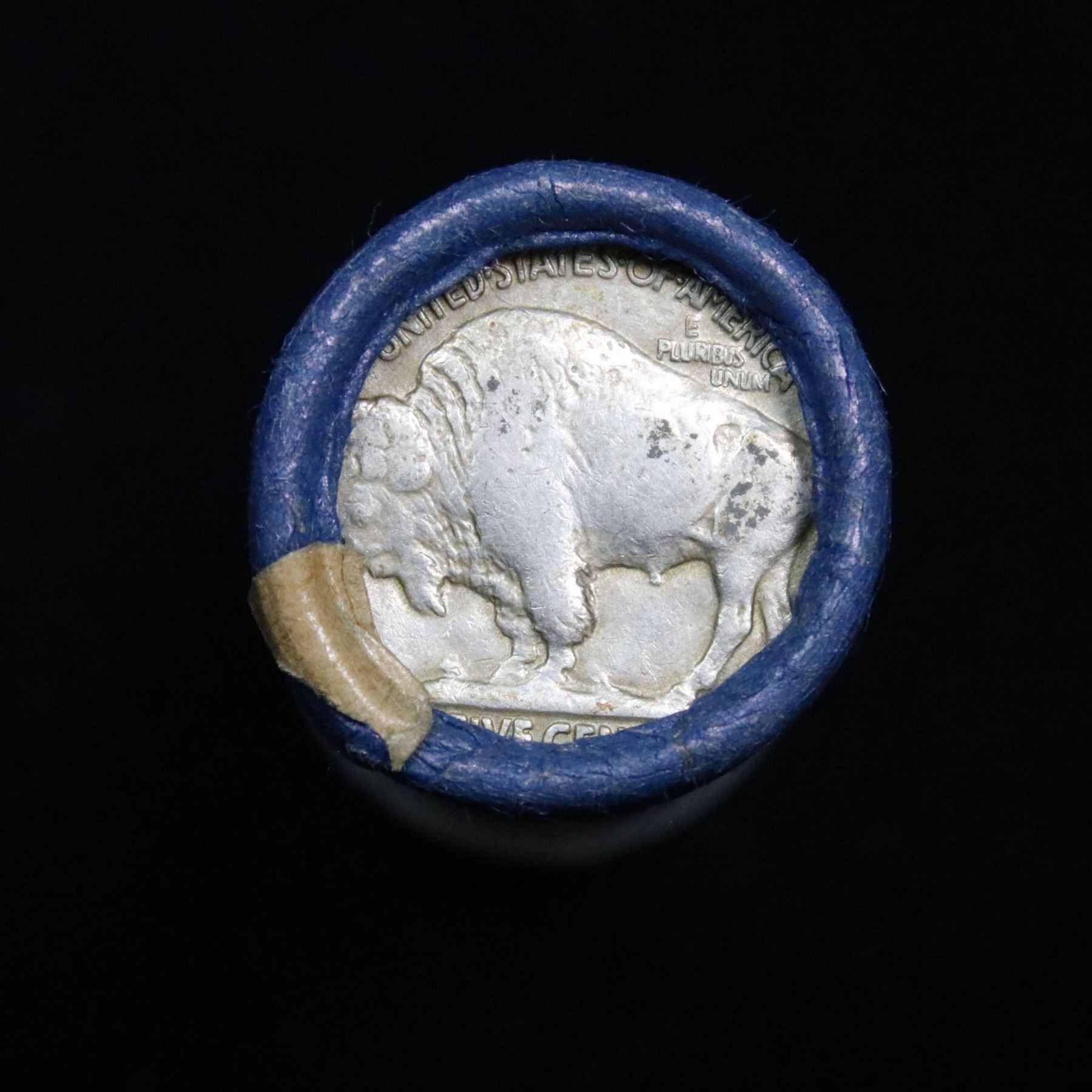 Buffalo Nickel Shotgun Roll in Old Bank Style Wrapper 1927 & d Mint Ends. The roll is held in an old, rare Bank style wrapper. They are all frrom one Estate. The ends on these rolls are very tight. We will guarantee they are all full dates.