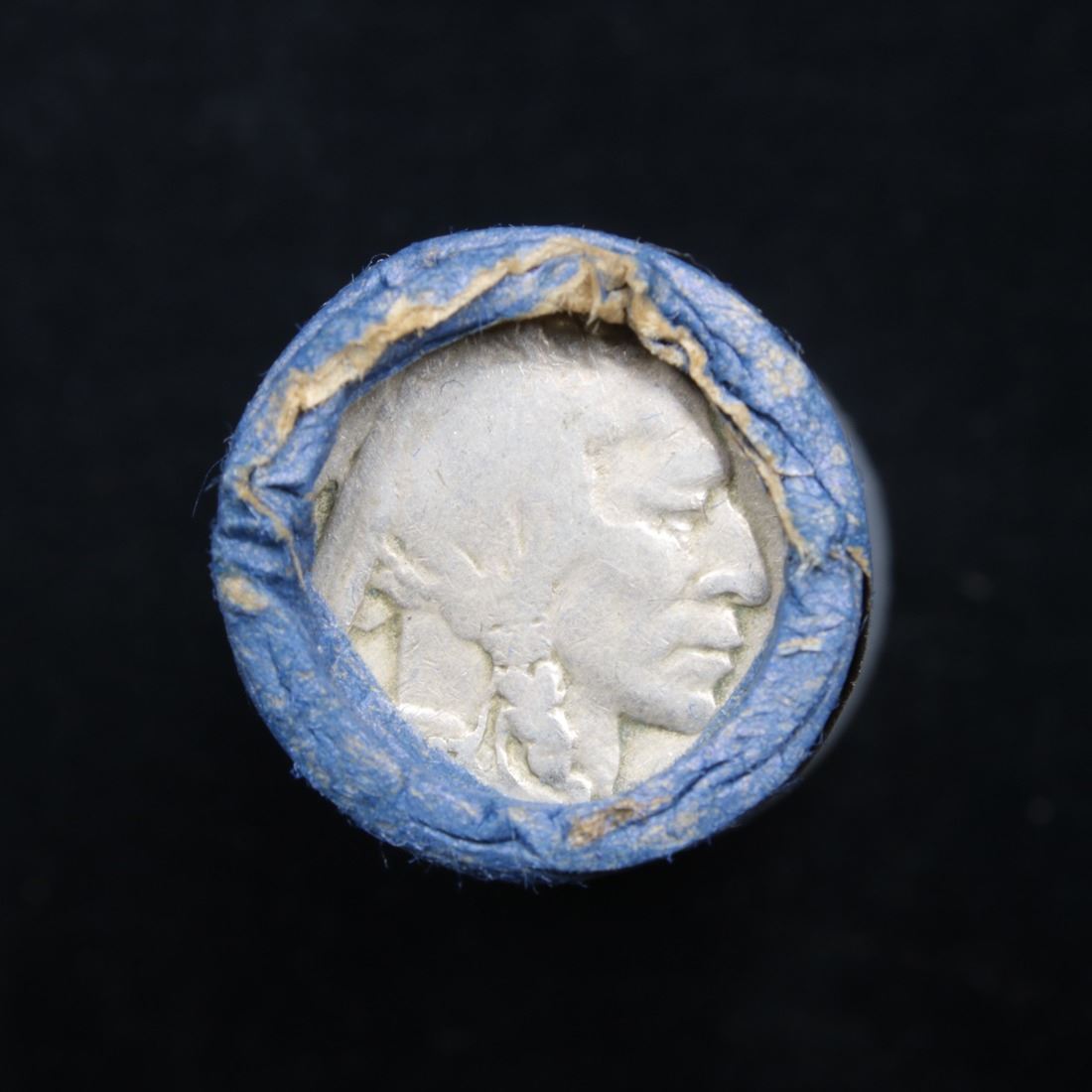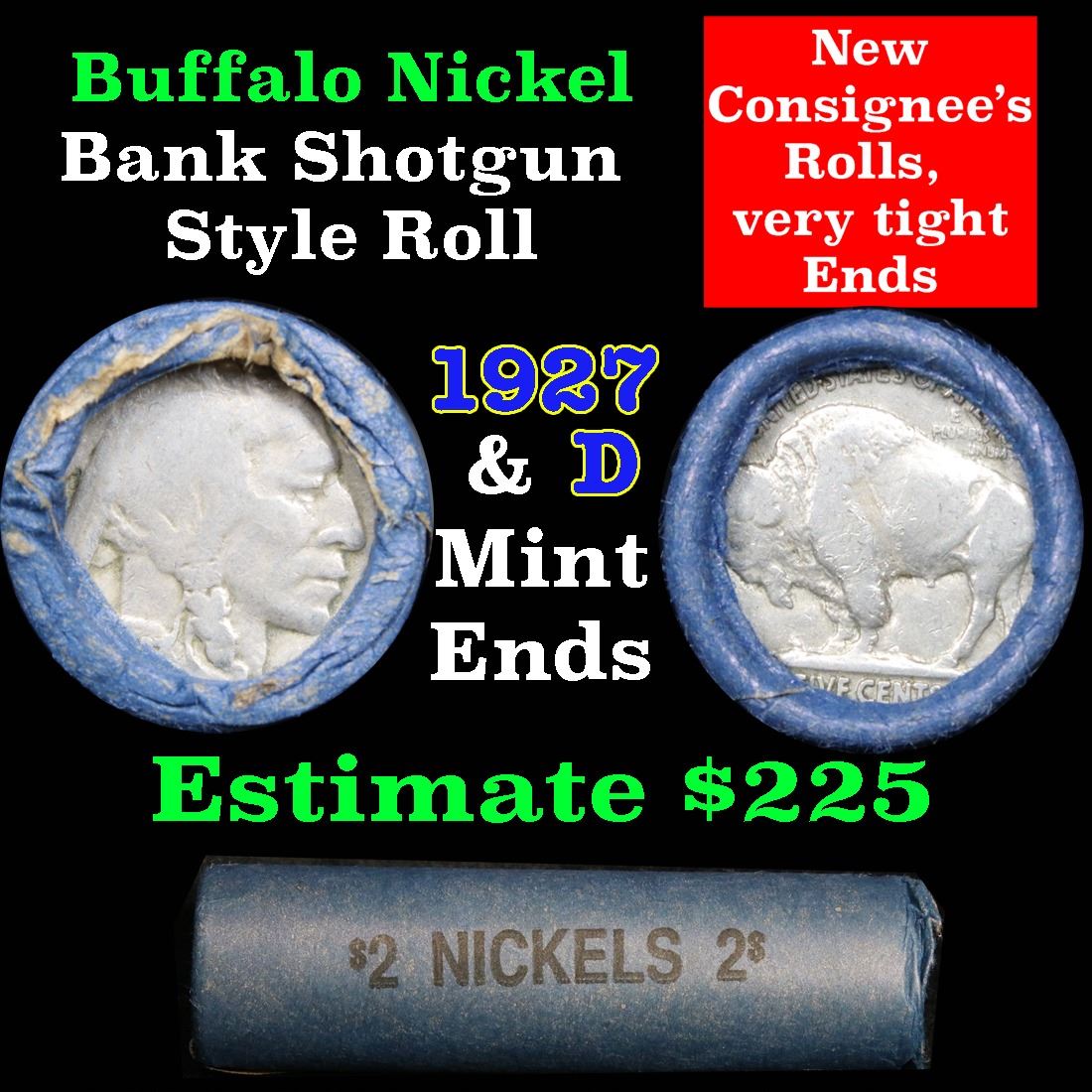 Buffalo Nickel Shotgun Roll in Old Bank Style Wrapper 1927 & d Mint Ends. The roll is held in an old, rare Bank style wrapper. They are all frrom one Estate. The ends on these rolls are very tight. We will guarantee they are all full dates.