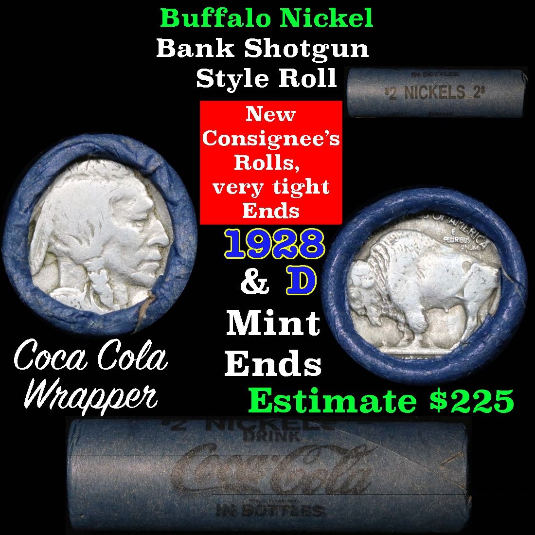 Buffalo Nickel Shotgun Roll in Old Bank Style Wrapper 1928 & d Mint Ends. The roll is held in an old, rare Bank style wrapper. They are all frrom one Estate. The ends on these rolls are very tight. We will guarantee they are all full dates.